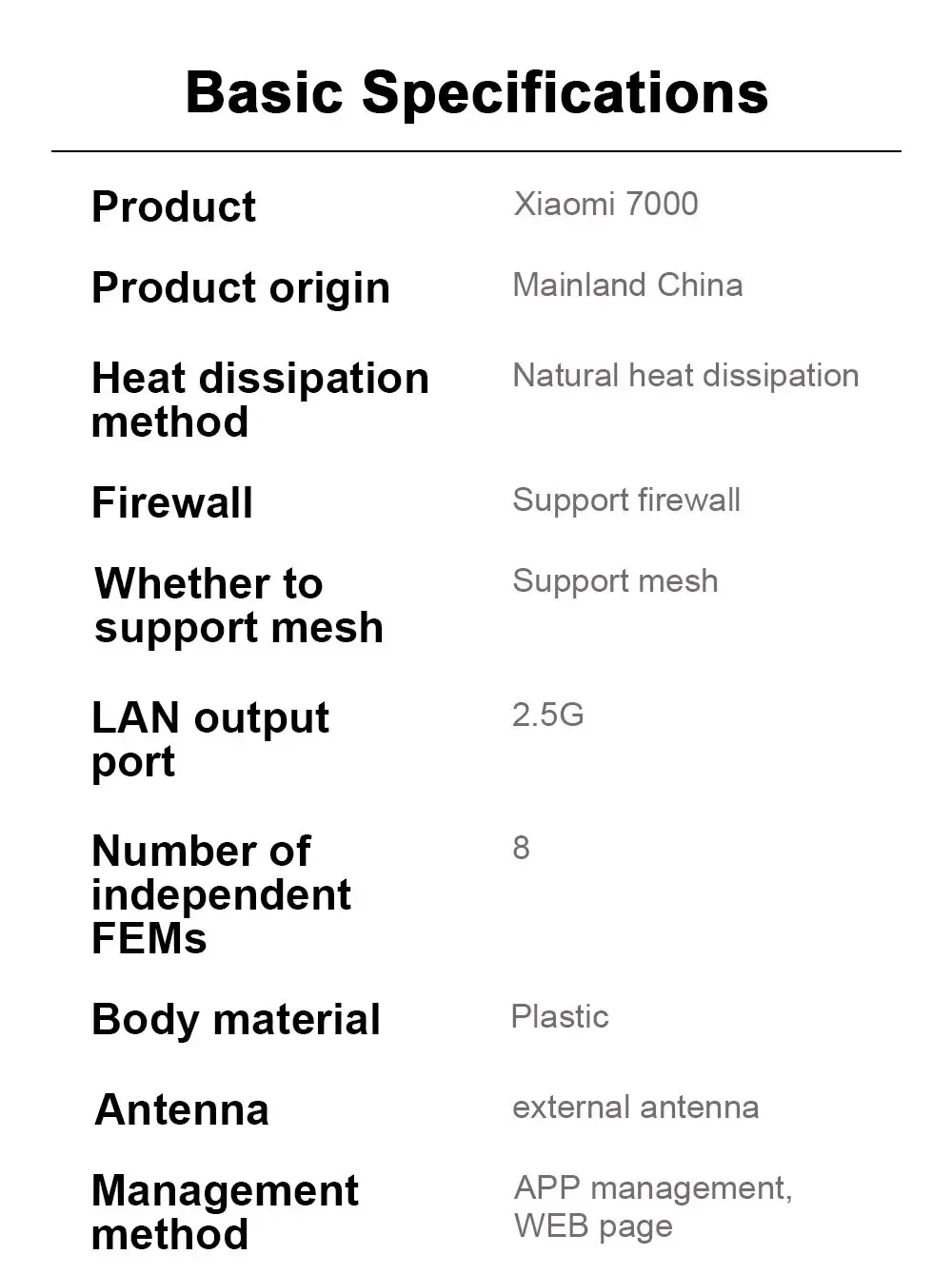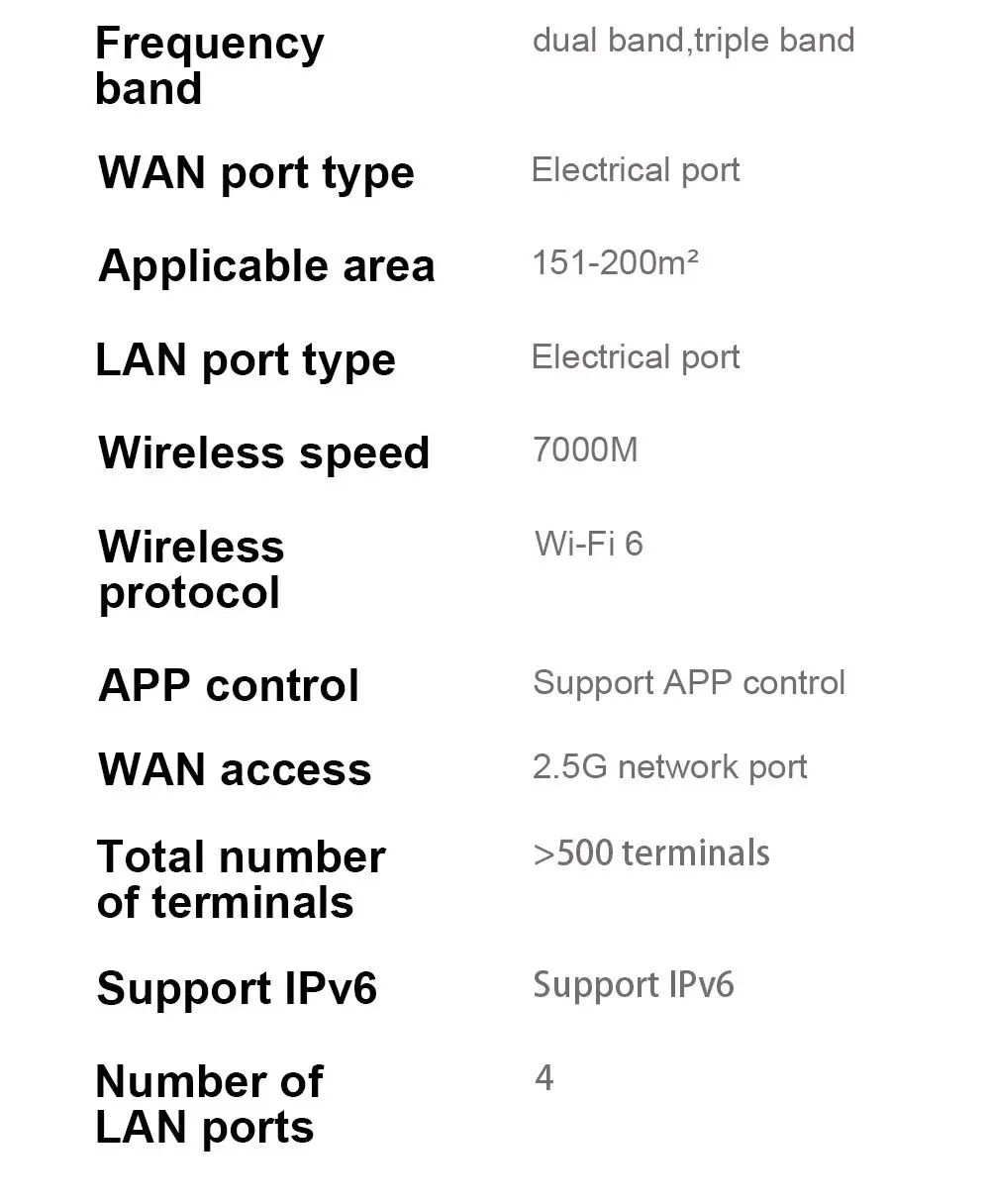 주의 사항:7000Mbps는 2.4G 주파수 대역을 포함하여 라우터의 무선 속도 사양 레벨이며 5G 주파수 대역의 총 최대 이론 속도는 6913 Mbps입니다.