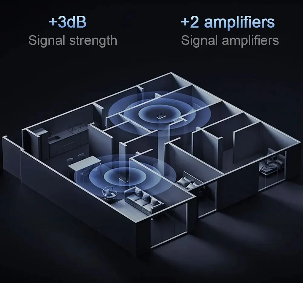 8 개의 독립적인 신호 증폭기, 강한 신호 침투, 효과적으로 큰 가정을 커버합니다:이전 세대와 비교하여 두 개의 고성능 신호 증폭기가 2.4GHz 대역에 추가되었으며 신호 수신이 더 민감하며 블라인드 스폿이 감소했습니다. 메쉬 기능과 결합하여 집 전체에 좋은 신호를 제공합니다.