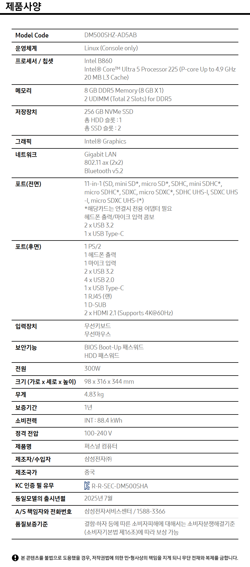 삼성전자 삼성 데스크탑 DM500SHZ-AD5A 혜택가 104만 포토한컴 15세대 i5 8GB 사무용 가정용