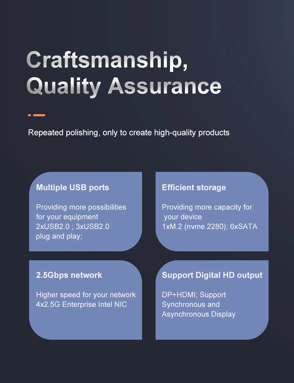 더 빠른 전송 속도를 원하십니까? 4 개의 인텔 2.5 기가비트 이더넷 포트가 전이중 모드를 지원합니다. 전송 속도가 더 효율적입니다.