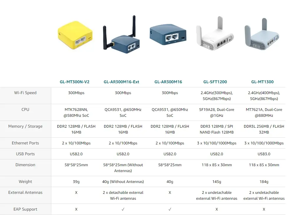 GL-MT300N-V2 새로운 칩 MT7628NN 으로 업그레이드되었으며 RAM은 64MB 에서 128 MB로 향상되었습니다. 또한 MTK 드라이버는 빠른 OpenVPN 암호화와 함께 Wi-Fi 연결을 개선하는 데 도움이됩니다. DIY 재미를 위해 4 개의 GPIO가 포함되어 있습니다. 이것으로부터, GL-MT300N-V2 여행에 가장 친한 친구입니다.