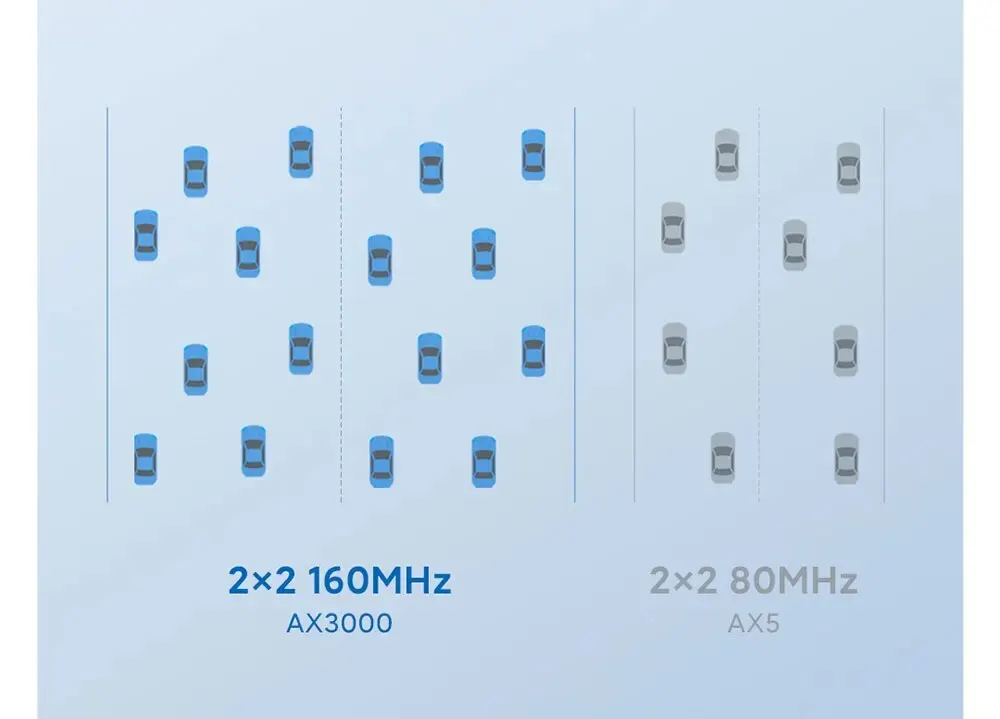 5G 160MHz 높은 대역폭두 배 대역폭 속도:대역폭은 고속도로와 같습니다. 80MNz 대역폭과 비교하여 AX3000 은 폭을 두 배로 늘리고 속도를 두 배로 늘립니다.