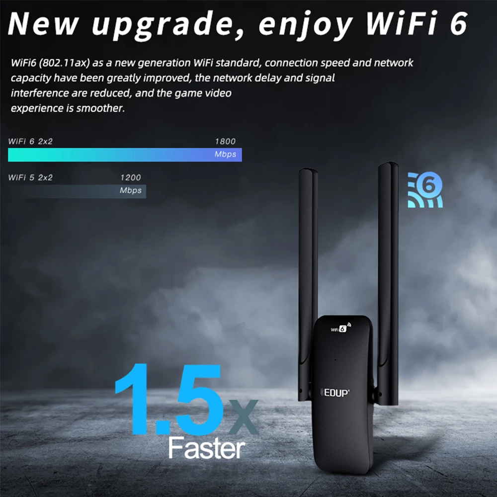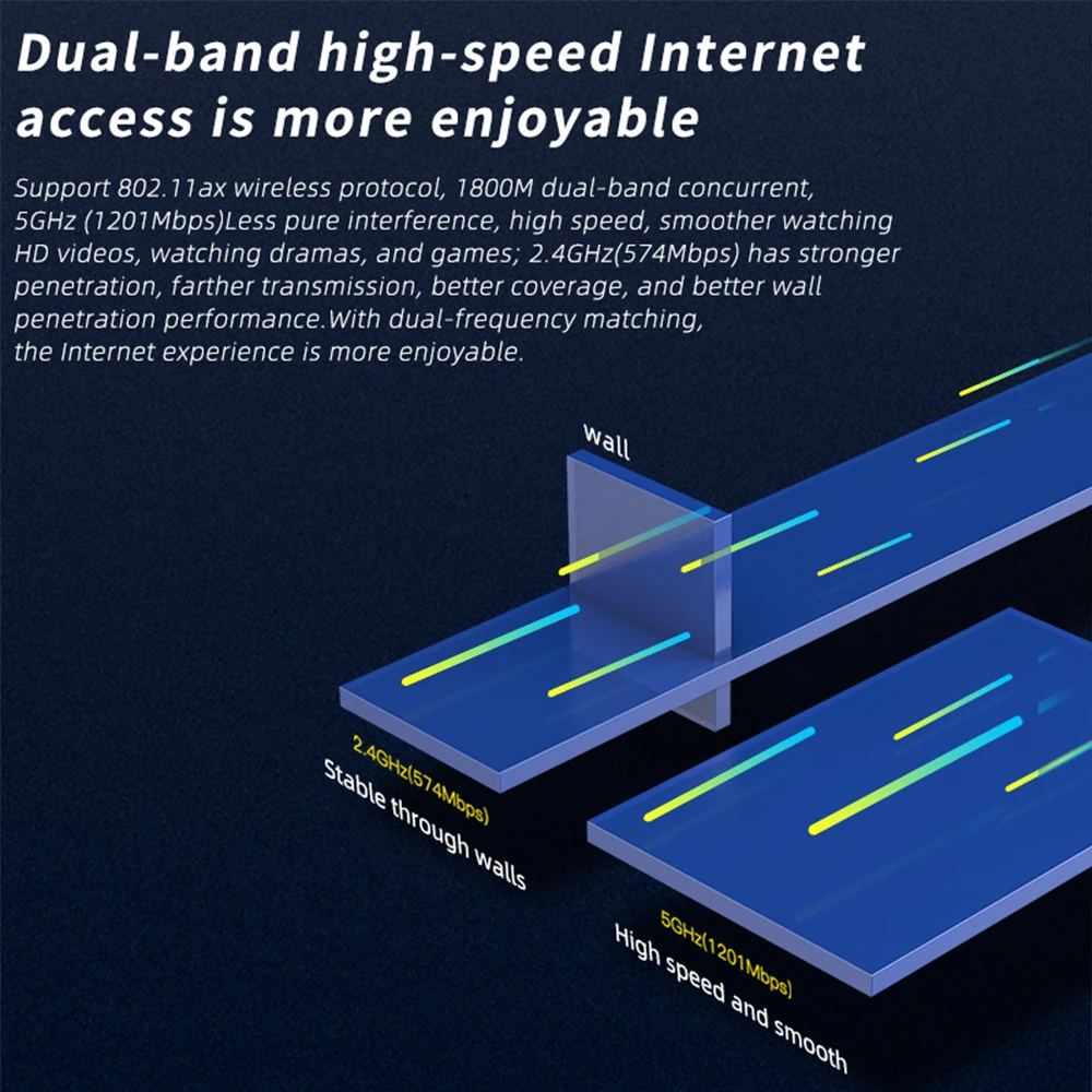 802.11ax 무선 프로토콜 지원, 1800Mbps 듀얼 밴드 동시, 5GHz (1201Mbps) 덜 순수한 간섭, 고속, HD 비디오 시청, 드라마 및 게임 시청; 2.4GHz(574Mbps) 는 더 강한 침투력, 더 먼 전송, 더 나은 커버리지 및 더 나은 벽 침투 성능을 제공합니다. 듀얼 주파수 매칭으로 인터넷 경험이 더욱 즐겁습니다.