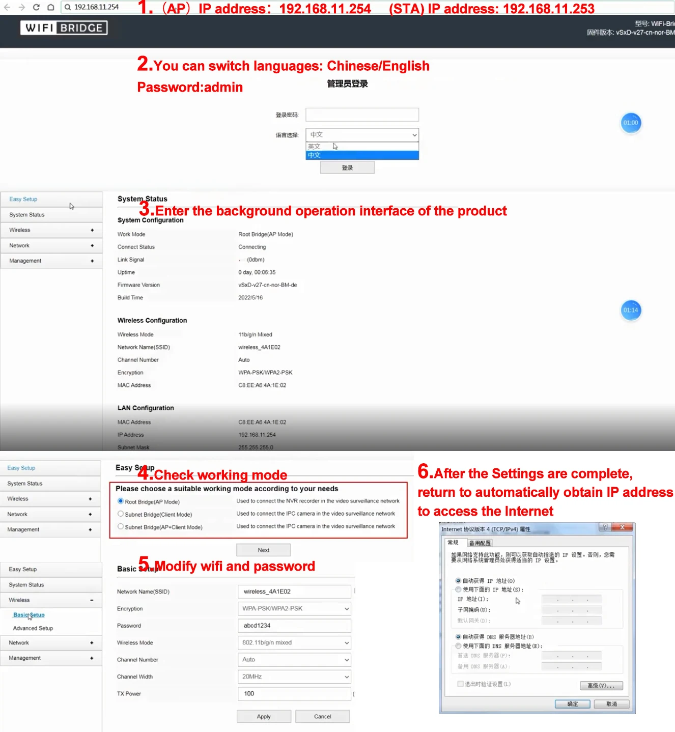 브리지 장치는 주로 장거리 신호 브리지 및 반복에 사용되며 CPE가 다른 라우터 장치와 연결될 때 IP 주소 충돌을 피하기 위해, 브리지 제품은 기본적으로 DHCP 기능 (자동 IP 주소 할당) 을 비활성화합니다. CPE를 설정해야합니다. 다음 단계를 구성하십시오.