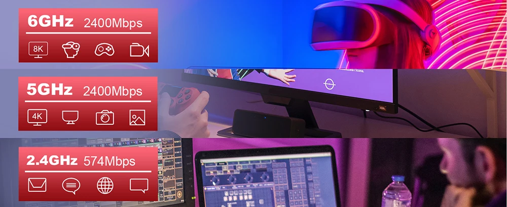 전송 속도:6Ghz-2400Mbps; 5Ghz-2400Mbps; 2.4Ghz-574Mbps (라우터는 802.11ax,160 Mhz를 지원해야 함)