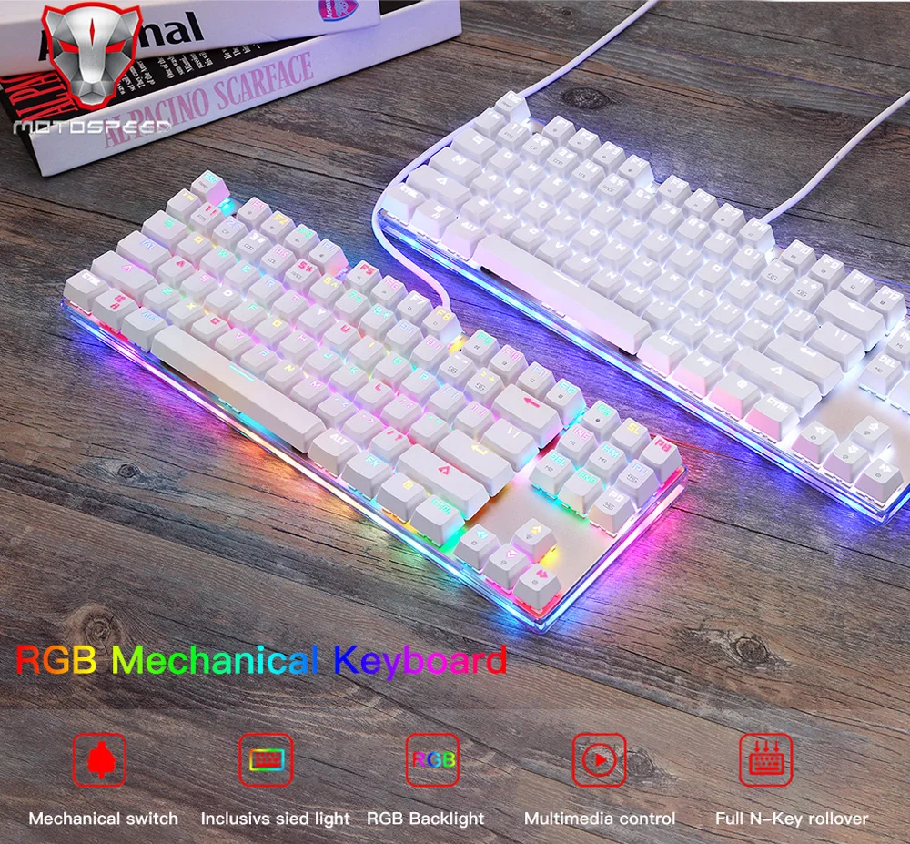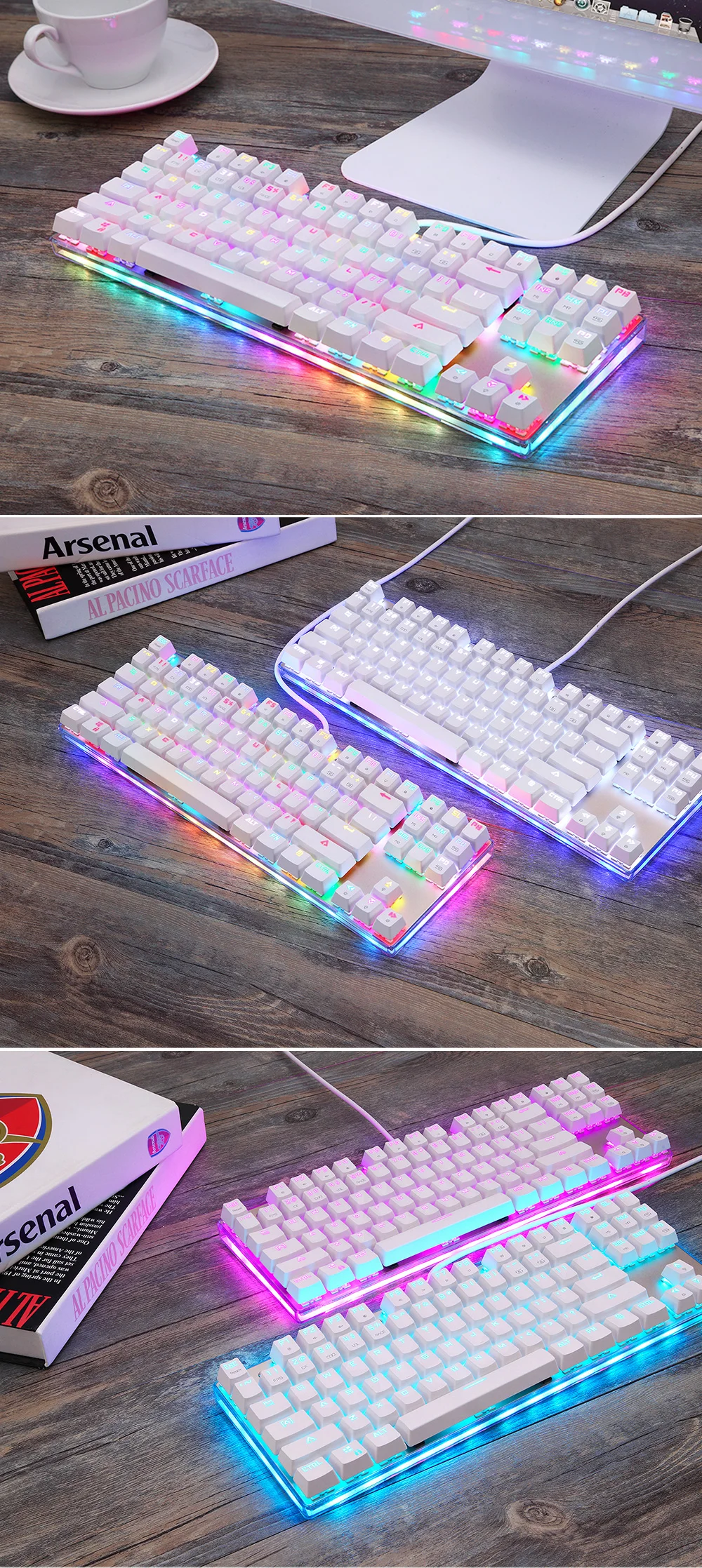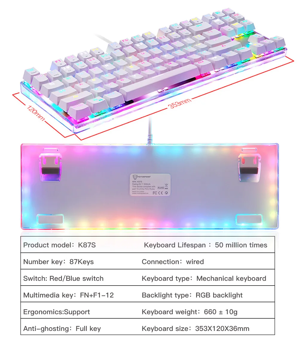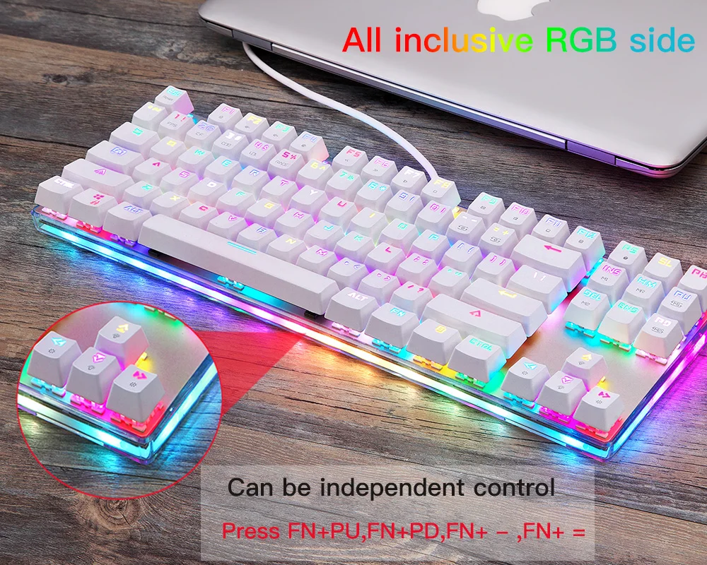 PC 게임용 RGB 백라이트 블루 스위치가있는 Motospeed K87S ABS USB2.0 유선 기계식 키보드 및 1.8m 케이블로 흰색 연결