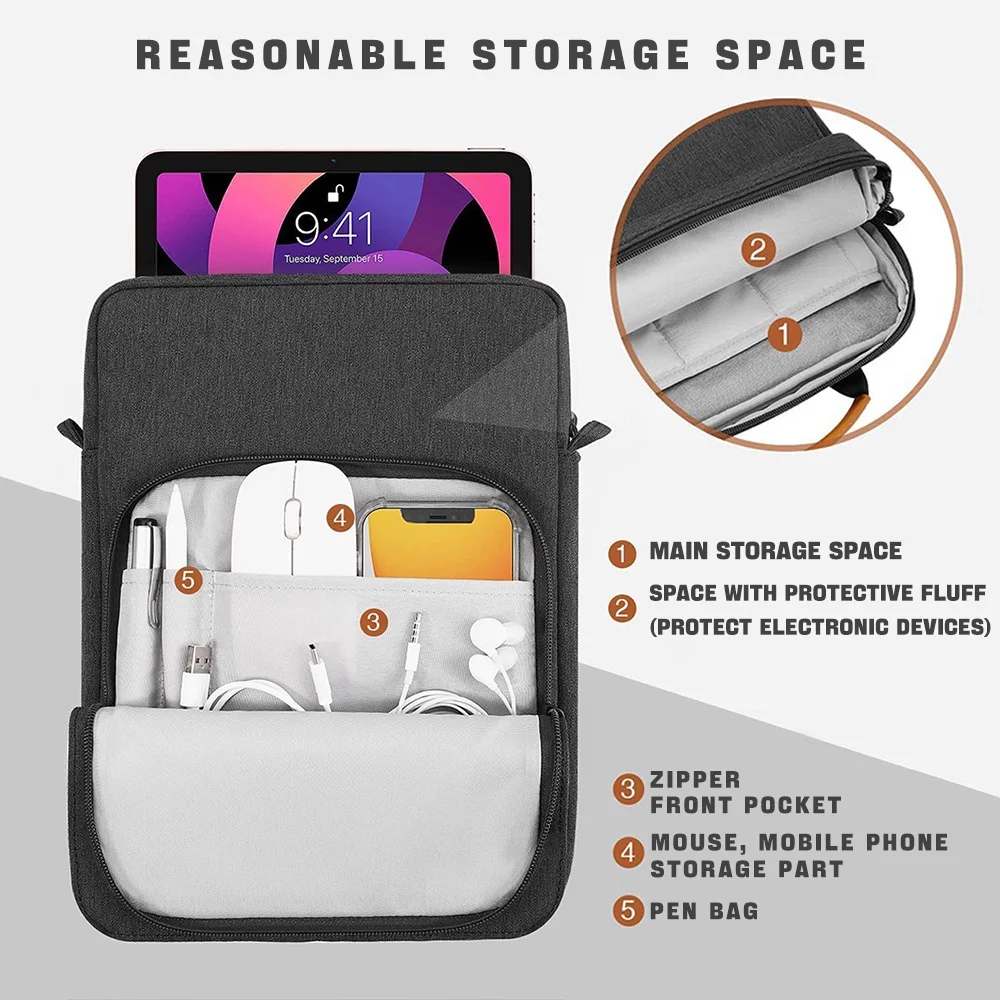 태블릿 숄더 가방은 유출 방지 소재로 만들어져 실수로 물방울이 튀는 것을 방지합니다. 메인 컴 파트먼트 포켓의 프리미엄 보풀 라이닝으로 범프 및 충격 흡수 및 우발적 인 긁힘으로부터 컴퓨터를 보호합니다.