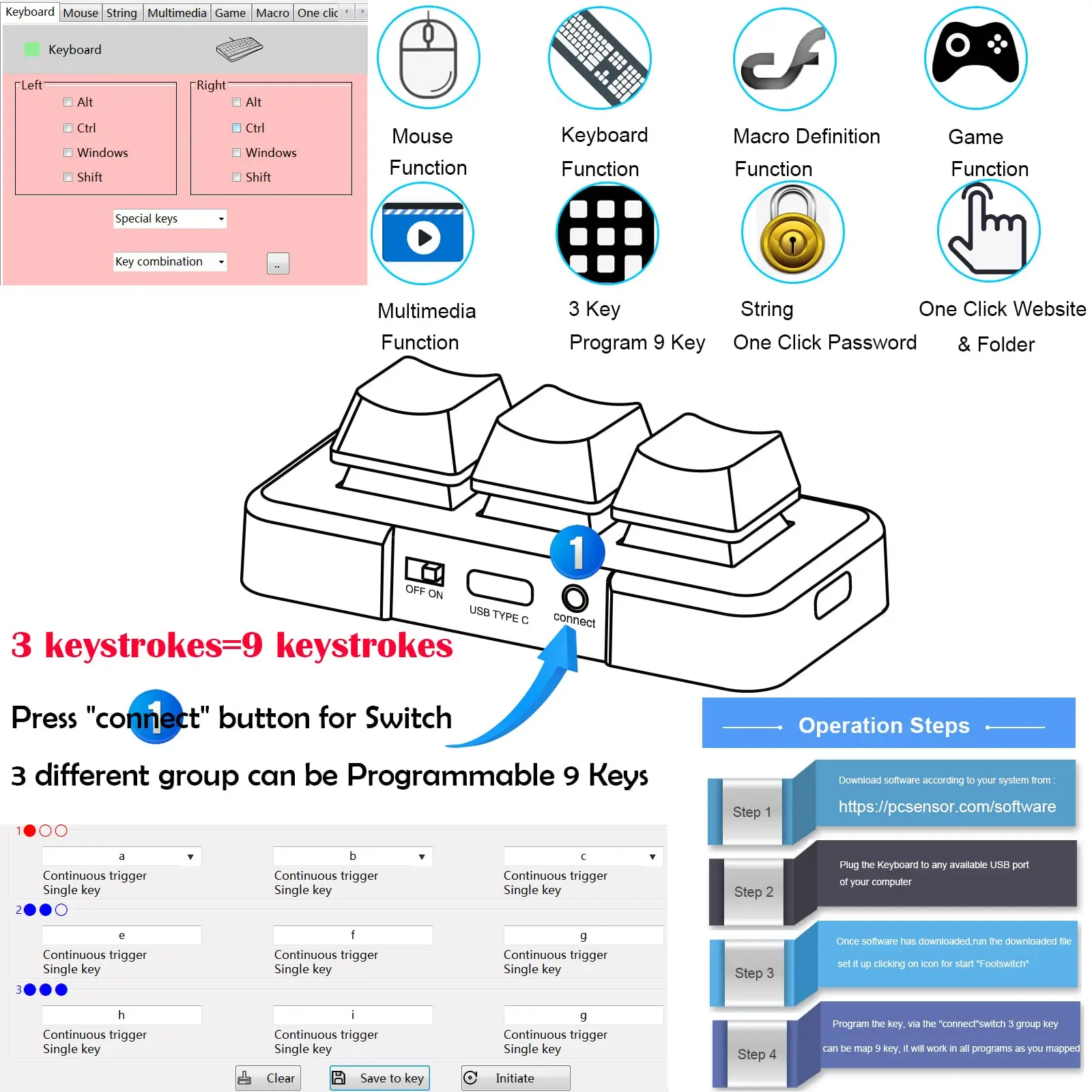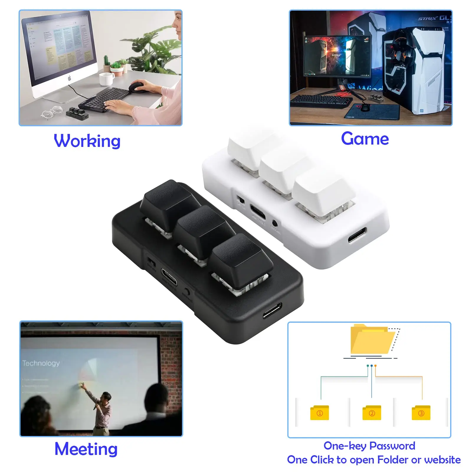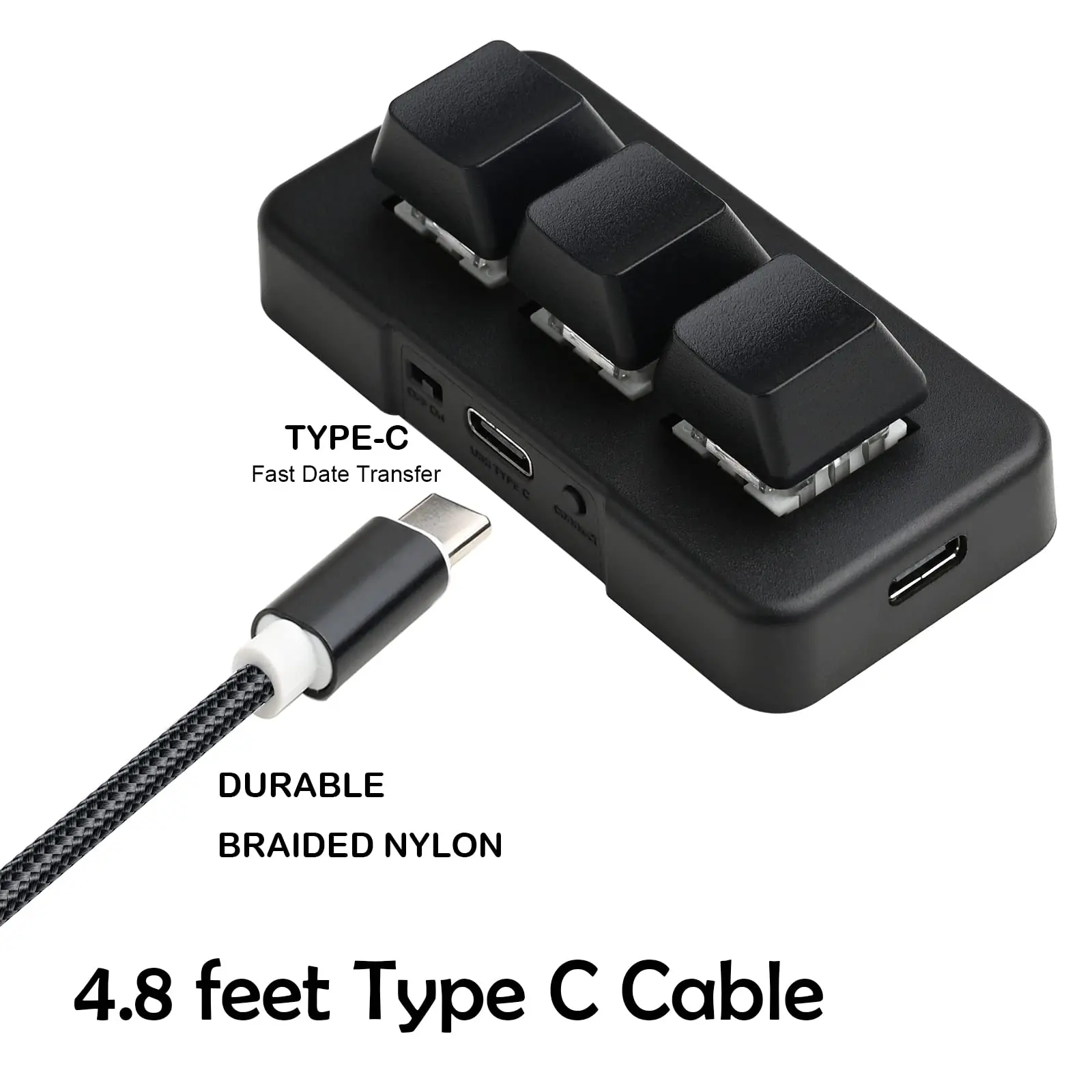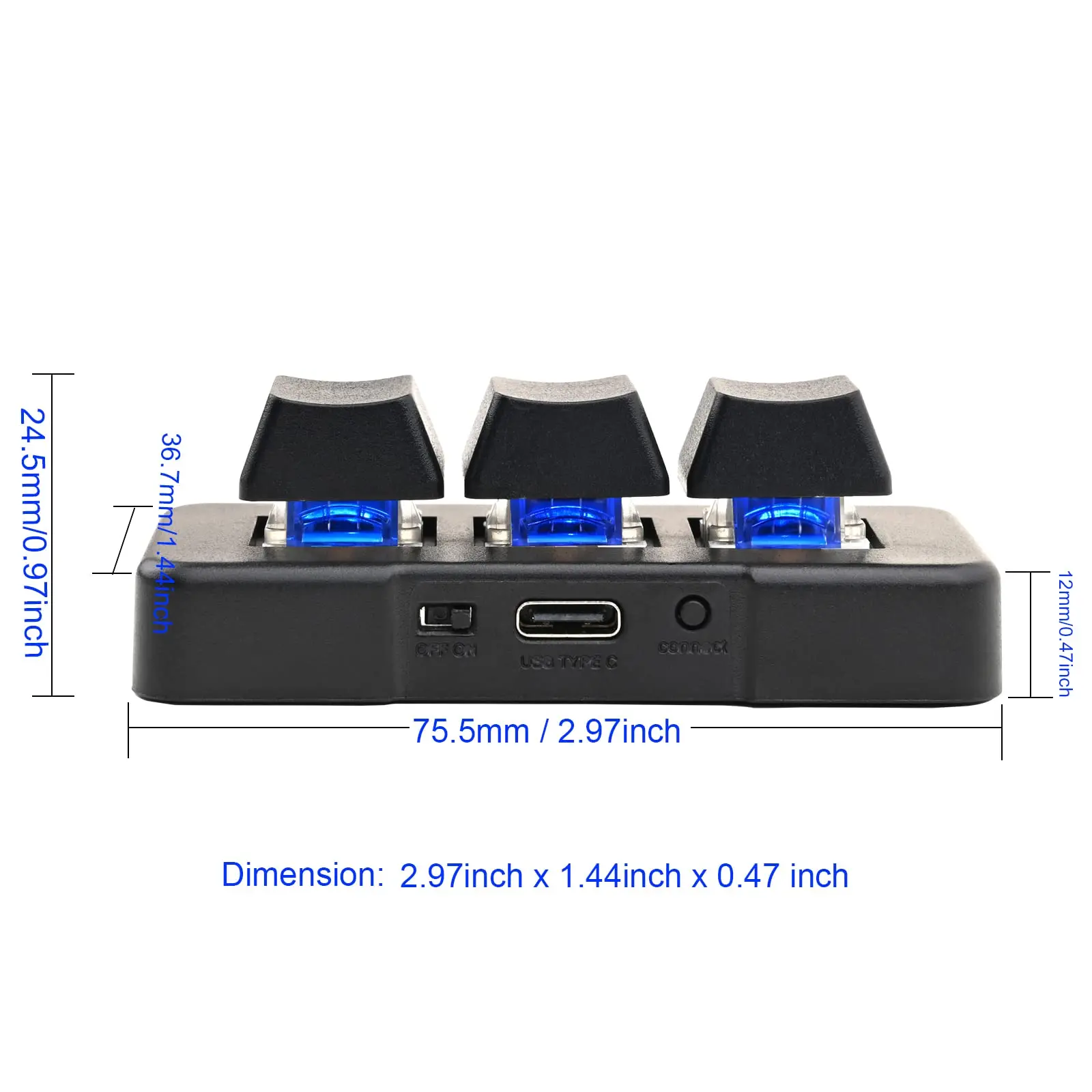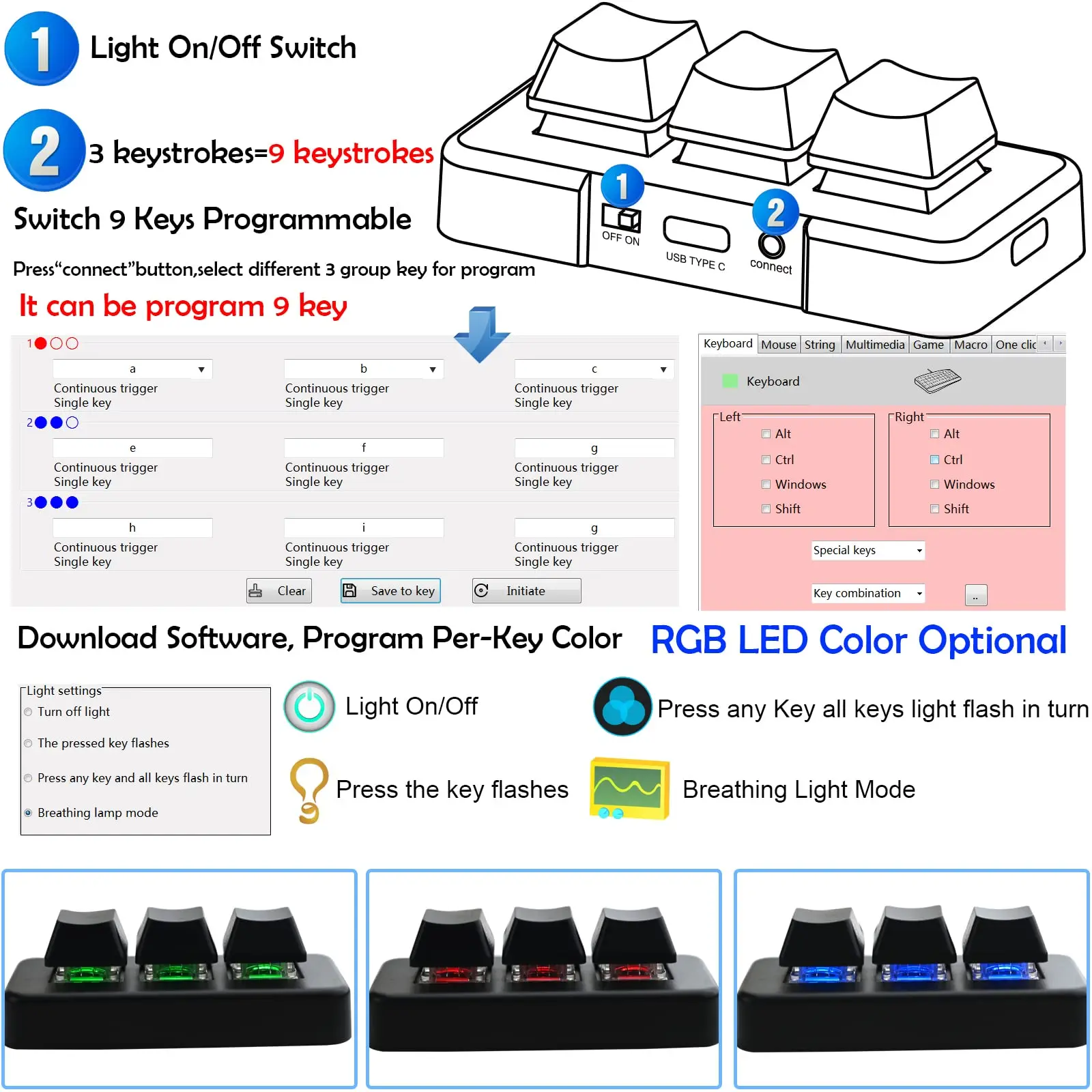 【 3 키 전체 프로그래밍 가능 9 키】 스위치를 통해 프로그램 3 부분 9 키 입력, 3 개 이상의 명령이 있으며 마우스 버튼, 미디어 키, 1 누름 암호로 프로그래밍 할 수 있습니다. 다중 문자 암호, 멀티미디어 키, 확대/축소 등 페이지 뒤로 설정. ..... 모든 종류의 용도.