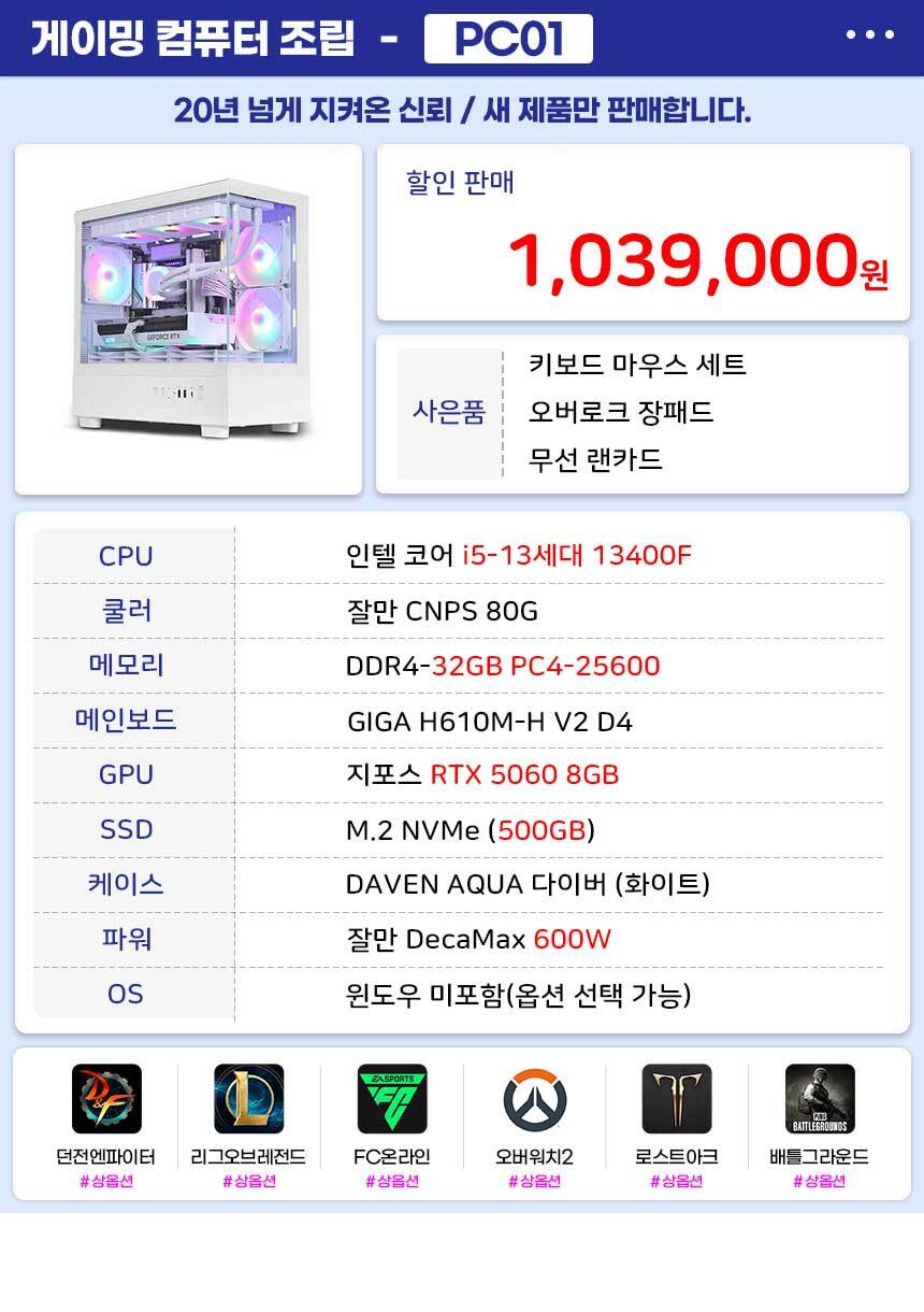포유컴퓨터 게이밍컴퓨터 조립 PC01 NW i5 13400f RTX5060 500G 32G