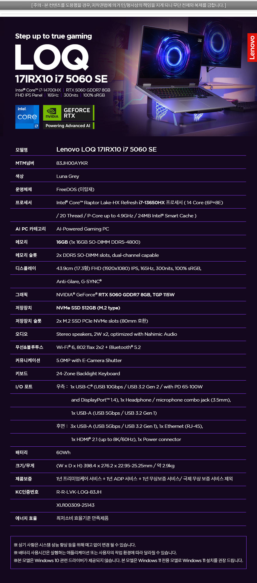 레노버 LOQ 17IRX10 i7 5060 SE (빅스139만)코어i7-13650HX/RTX5060그래픽/17.3형 게이밍노트북