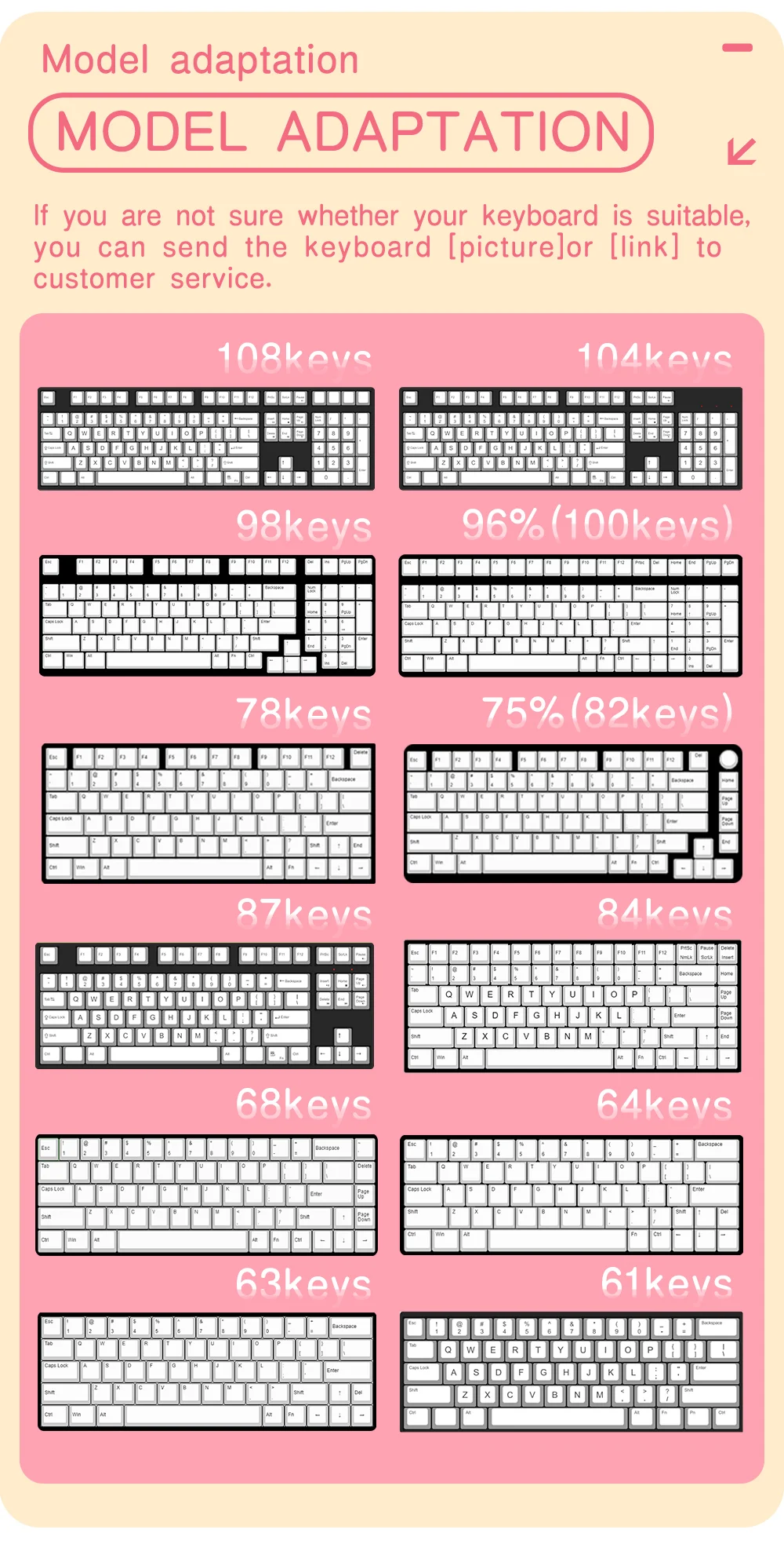 ★【대부분의 기계식 키보드와 호환】 이 키캡 세트는 대부분의 dz60/GK61/63/64/68/KBD75/81/82/83/84/87/96(100key) 에서 작동합니다./98/102/104/108 체리 MX 스위치 기계식 게임 키보드 및 Outemu, Kailh 및 Gateron 스위치와 가장 표준 ANSI 키보드에 적합합니다.