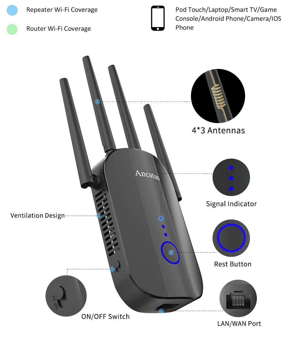 와이파이 공유기 유무선 ANCATUS 신호 증폭기 무선 확장기 라우터 A2 AC1200 5g 80211ac