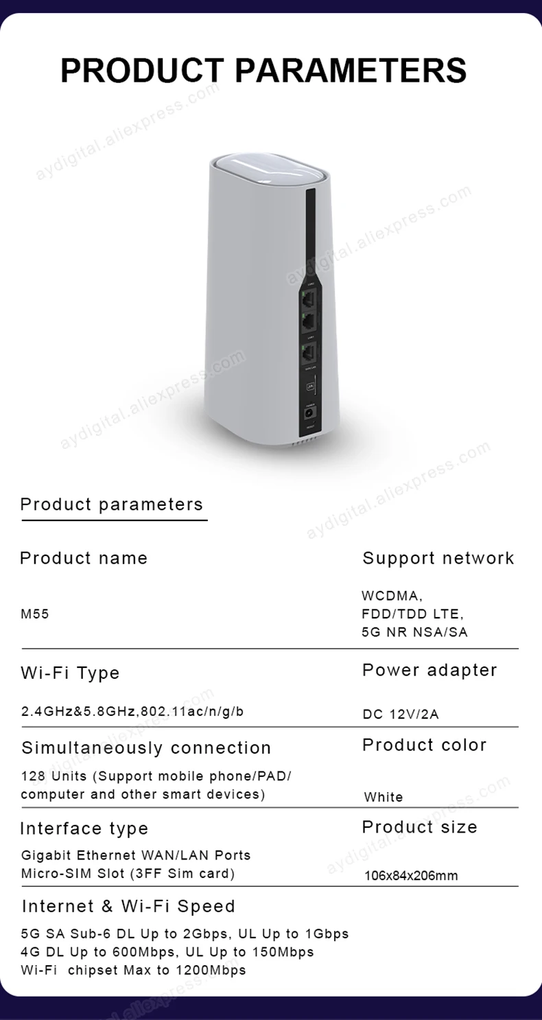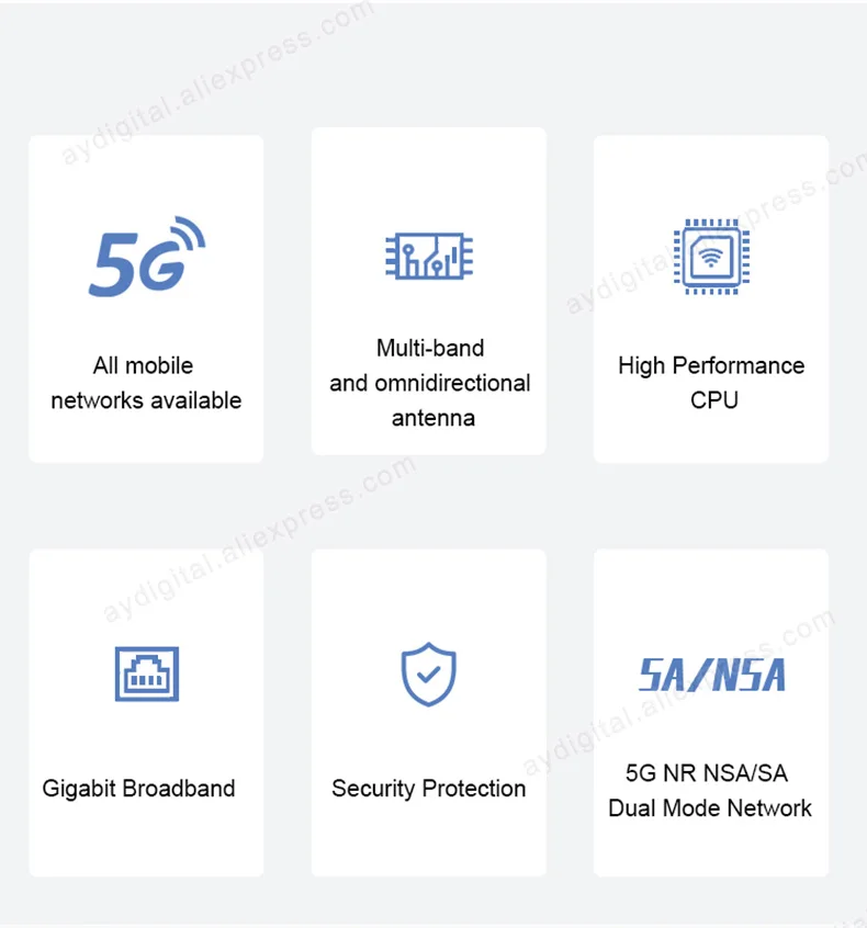 이것은 우리 매장의 새로운 제품 라인이며, 고성능 및 속도 5G 라우터입니다. 그것은 매우 빠른 속도 5G 네트워크, 최대 2.2Gbps 다운로드 속도 5G 모듈, 최대 1200Mbps 무선 네트워크 연결 및 1000Mbps 유선 네트워크 연결 용량을 지원합니다. VPN, 방화벽, NAS, SMS 수신, WPS 및 기타 고급 기능을 포함하여 4G 및 3G 네트워크와 이전 버전과 호환됩니다.