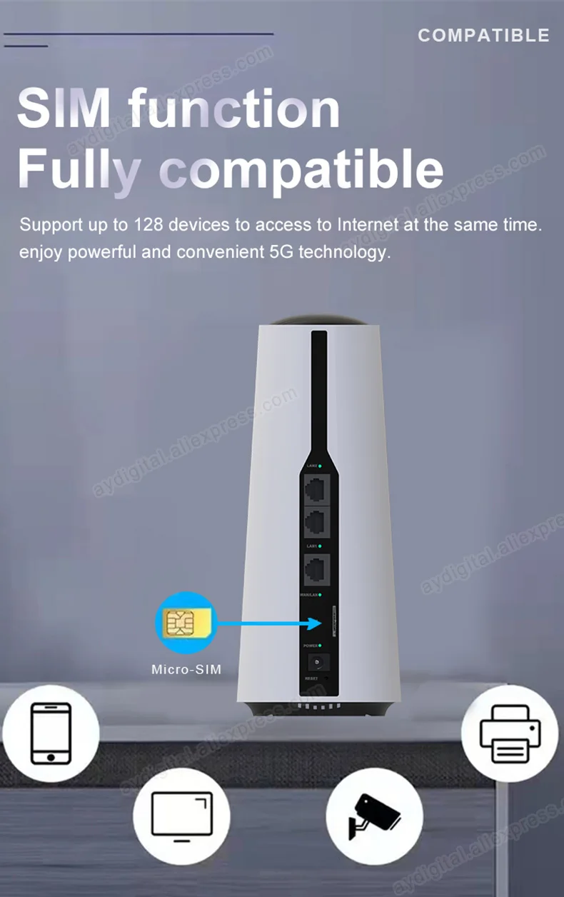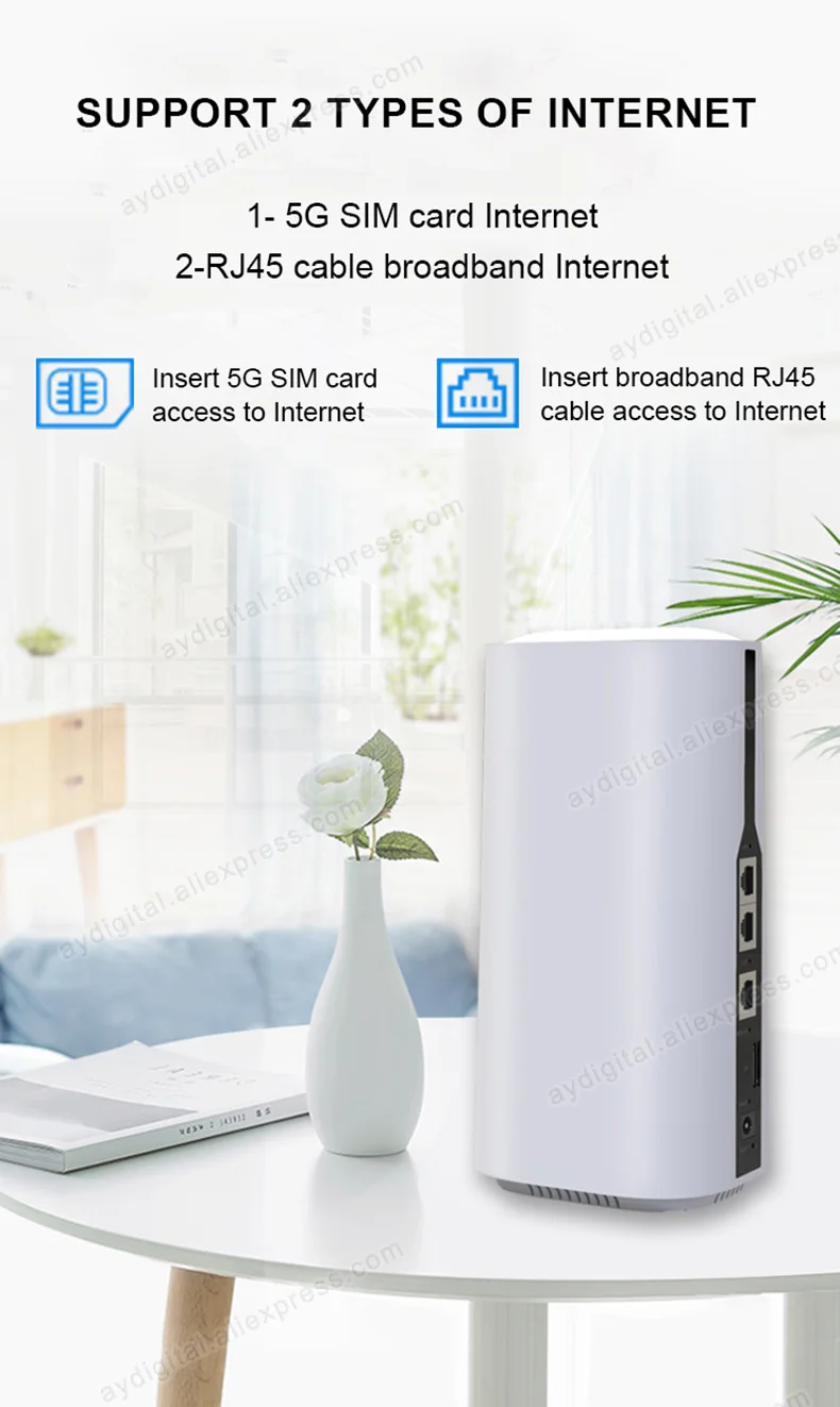 이 5G 라우터에는 SIM 카드가 포함되어 있지 않으며 사용자는이 장치를 사용하려면 지역 사업자로부터 SIM 카드를 구입해야하며 라우터를 Wi-Fi 모뎀으로 사용할 수도 있습니다.