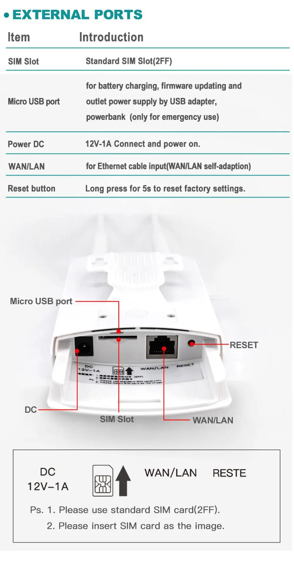 4. 4G 라우터는 범용 일반 SIM 카드 만 지원하며 IOT 카드 및 로밍 카드는 지원하지 않습니다. SIM 카드를 구입할 때 라우터에서 작동 할 수 있는지 물어보십시오.