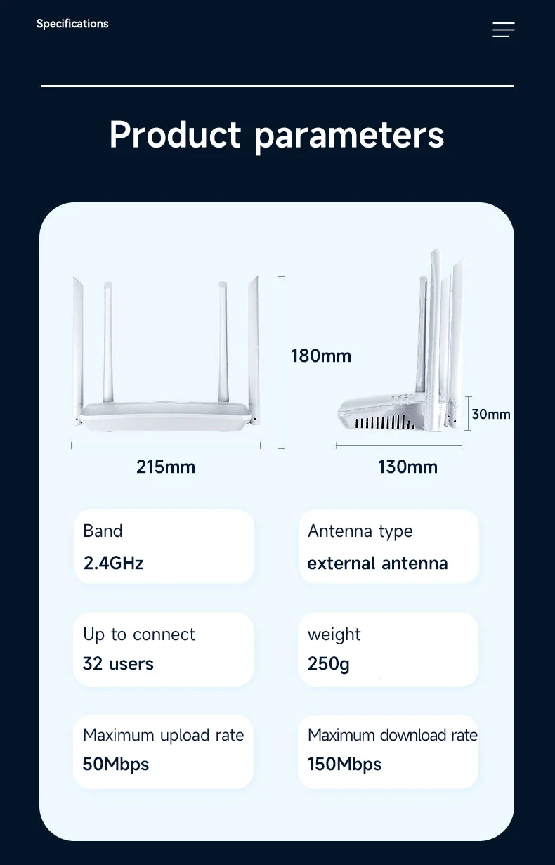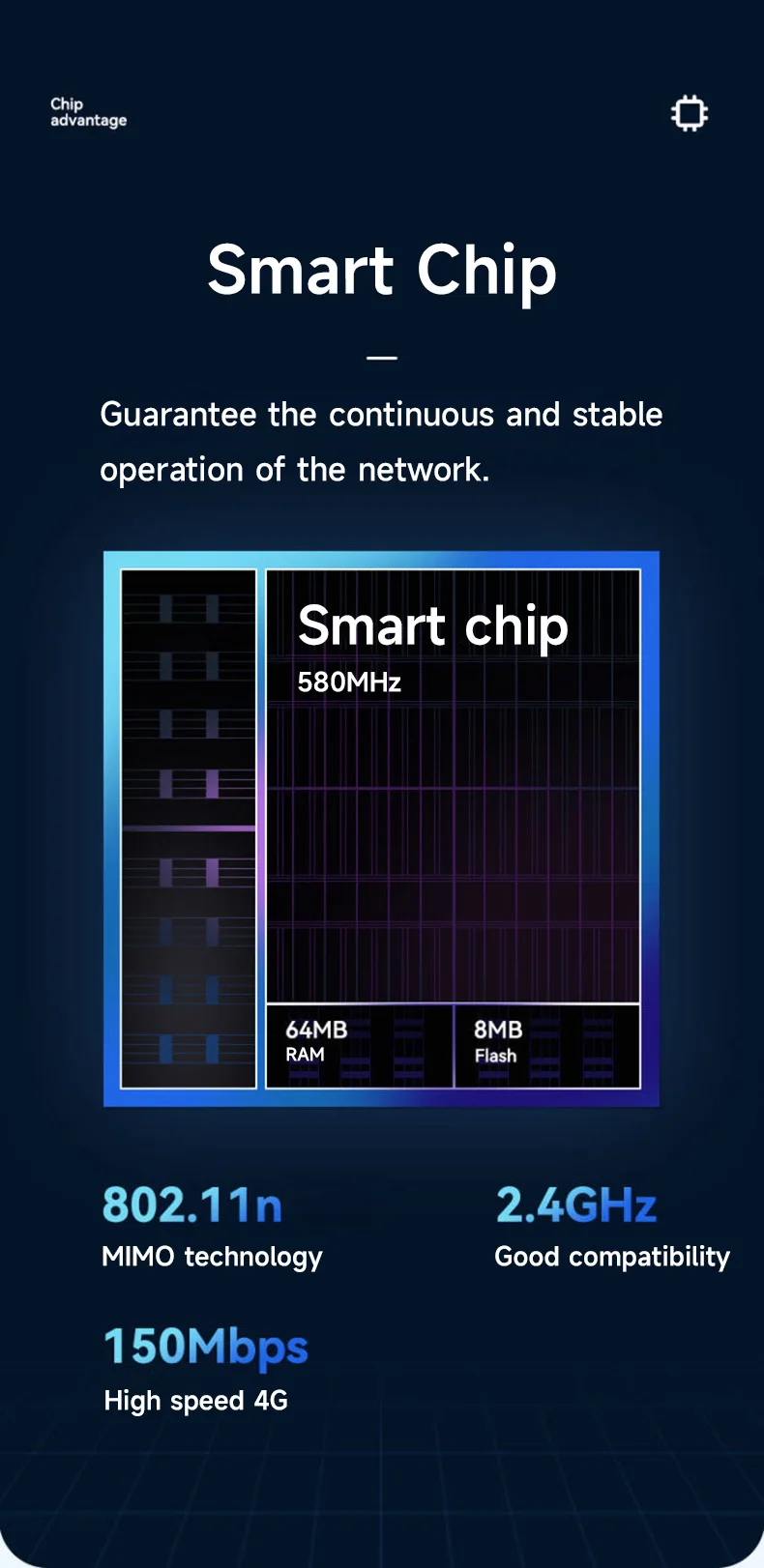 라우터의 4G 칩셋 최고 용량은 150 M이며, 4G 기지국의 이론적 최고 속도는 150 M입니다. 그러나, 4G 기지국은 하나의 사용자에게 완전한 150M 대역폭을 제공하는 대신 동시에 많은 4G 사용자에게 서비스를 제공하고, 4G 신호 강도, SIM 카드 제한 및 환경은 네트워크 속도에도 영향을 미칩니다.