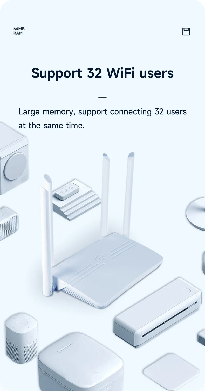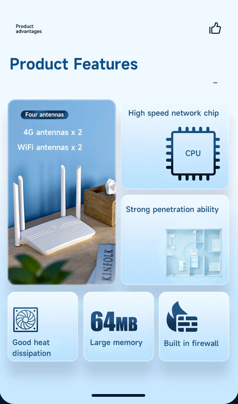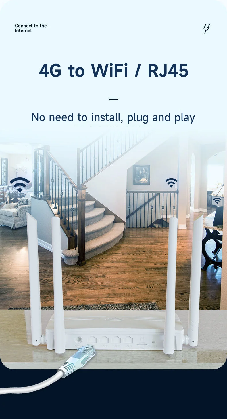 이 장치는 고속 4G LTE WIFI 액세스를 제공하고 32 WIFI 사용자 및 3 RJ45 LAN 포트 사용자를 지원합니다. 일반 이더넷 무선 라우터로도 작동 할 수 있습니다.
