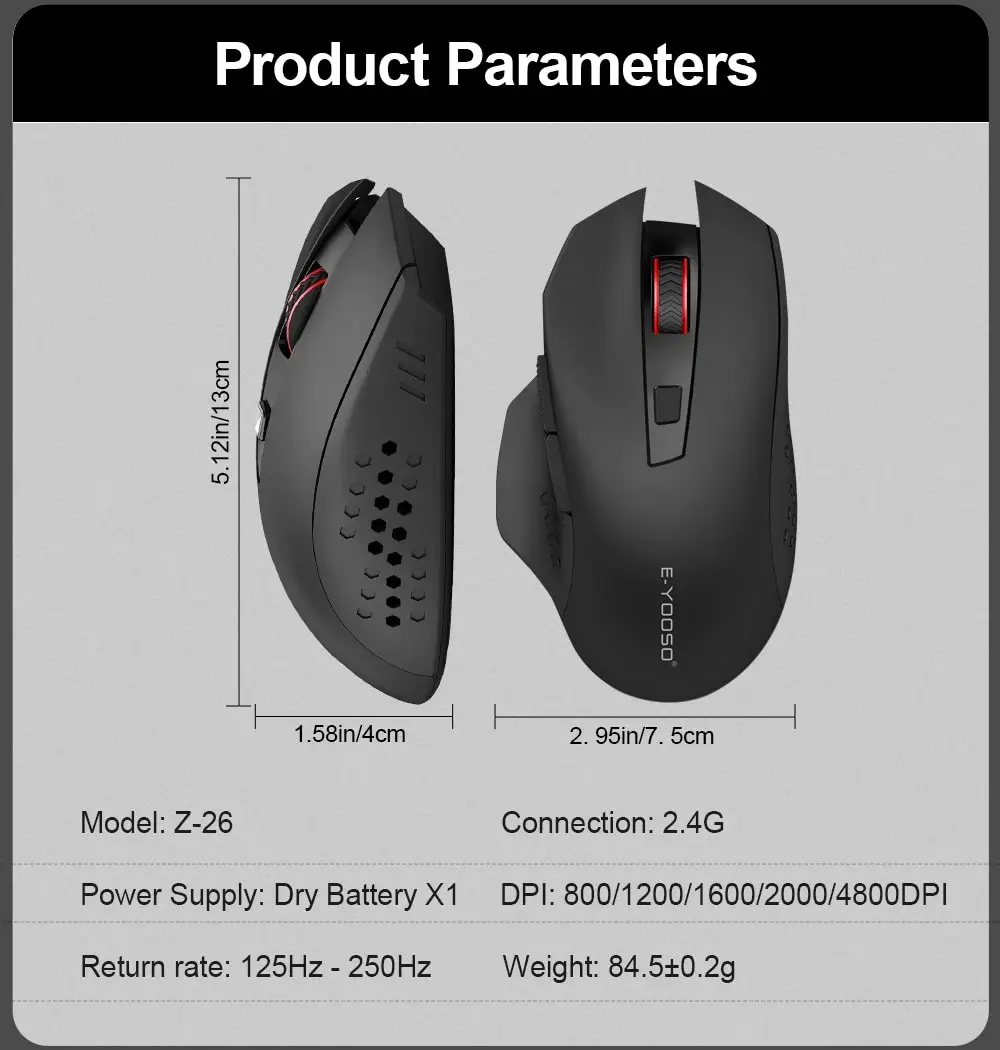땀 방지 및 인체 공학적 디자인: E-YOOSO 마우스는 미끄럼 방지 및 땀 방지 사용자 정의 소재, 편안한 윤곽선 모양으로 제작 마우스의 양쪽에 손가락이 얹혀 있으면 추가 지원이 제공되며 모든 손가락이 오랫동안 편안하게 잡을 수 있습니다. 또한 앞으로 및 뒤로 버튼을 가지고, 웹 서핑을보다 효율적으로, 50,000,000 개 이상의 키 입력을위한 완벽한 성능을 확인하십시오!