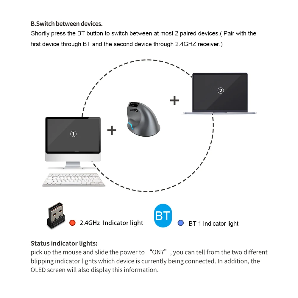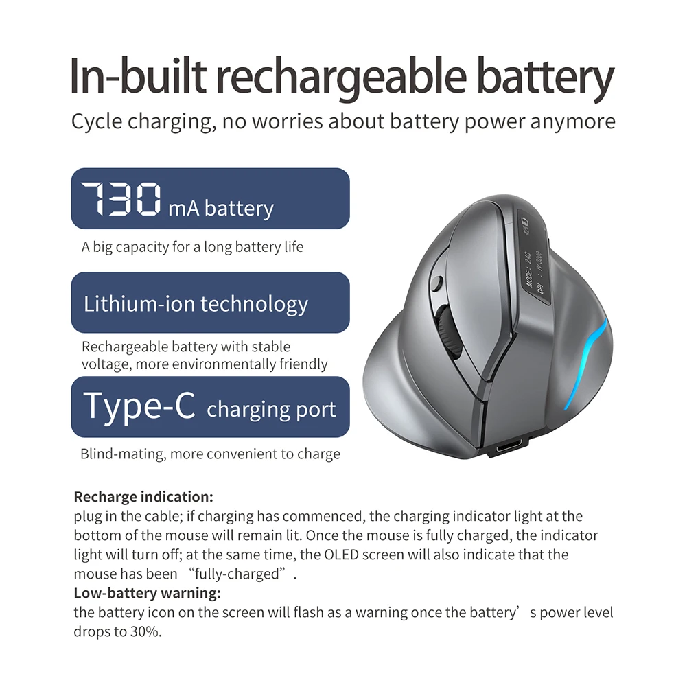 특징: 1. 듀얼 모드 작동:수신기를 연결하여 2.4G 무선 모드를 사용하거나 블루투스를 사용할 수 있습니다. -호환 가능두 장치를 동시에 작동시키는 연결. 2. LCD 디스플레이 기능:작업 모드, 전원, DPI 값 정보의 실시간 표시. 3. 충전식 배터리 내장:내장 730mAh 리튬 이온 배터리, TYPE-C 인터페이스와 순환 충전, 더 이상 배터리 걱정 4. DPI 조정:DPI 키를 누르면 커서 이동 속도가 화면에 동 기적으로 표시됩니다. 5. 컬러 조명 효과:다채로운 분위기의 조명 디자인으로 하단 토글 컨트롤로 끄고 켤 수 있습니다. "라이트 스위치" 키를 사용하여 네온, 호흡 및 단색을 선택할 수 있습니다. 사양: 인증: 없음 원산지: 중국 본토 인터페이스 유형: USB 손 방향: 오른쪽 전원 유형: 충전식 이름: 듀얼 모드 자동 디스플레이 수직 마우스 색상 분류: 진한 회색 키 수: 8 작업 모드: 광전 광학 해상도: 1000-1600-2400-3200dpi 배터리 용량: 730mA 충전 라인 길이: 1.5M 주파수: 2402.85MHZ-2480.82MHZ 무선 거리: ≥ 10m 무선 기술: 블루투스 -호환 가능 무선 거리: 10m 작동 전압/전류: 3.7V-20mA 주요 수명: 5 백만 번 롤러의 수명: 1.2 백만 회전 인체 공학 지원: 예 2.4GHz 반환율: 125Hz 블루투스 호환 반환 속도: 115Hz 제품 크기: 110*75*72mm/4.3*2.9 * 2.8in 제품 무게: 105g 지시: 바로 가기 키 기능: 사이드 버튼은 공통 기능을 통합하여 웹 페이지 및 문서를 쉽게 탐색하고 개별 요구를 충족시킵니다. 뛰어난 자동 성능: 불필요한 키 톤을 제거합니다. 인체 공학적 외관 디자인: 느낌을 최적화하고 편안한 작동 경험을 제공합니다. 참고: