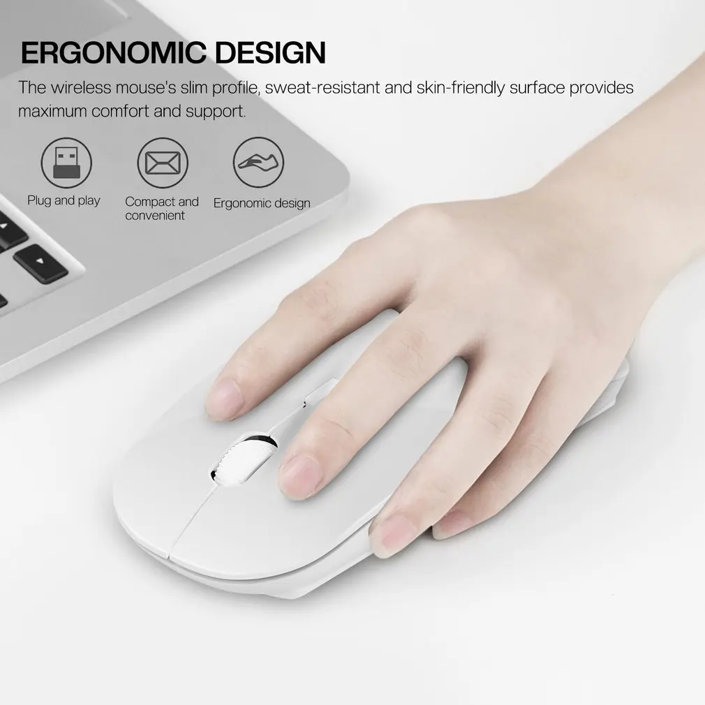 4. 최고의 느낌: 무선 마우스의 슬림 프로파일, 땀 방지 및 피부 친화적 표면은 최상의 편안함과 지지력을 제공합니다. 멋진 링과 핑거 지지대는 더욱 편안합니다. 튼튼한 롤러로 롤링 할 때 손이 미끄러지지 않습니다.