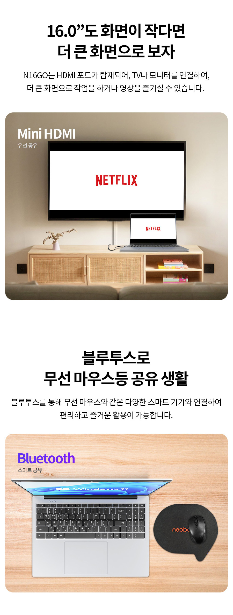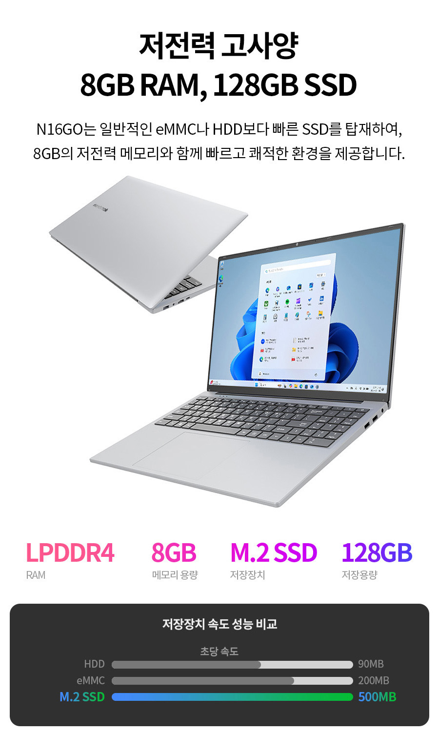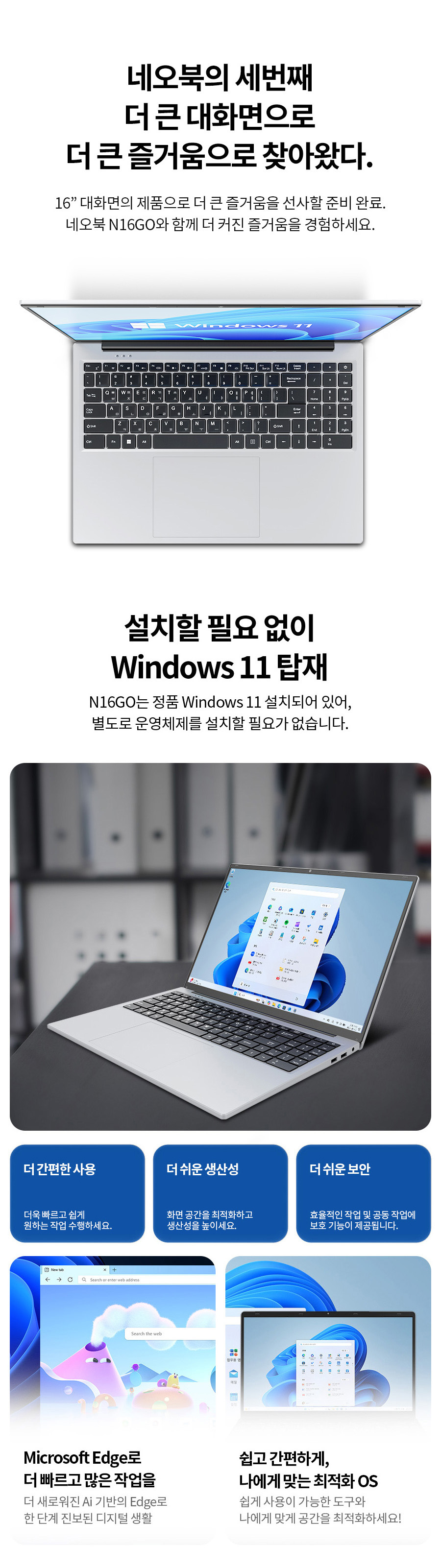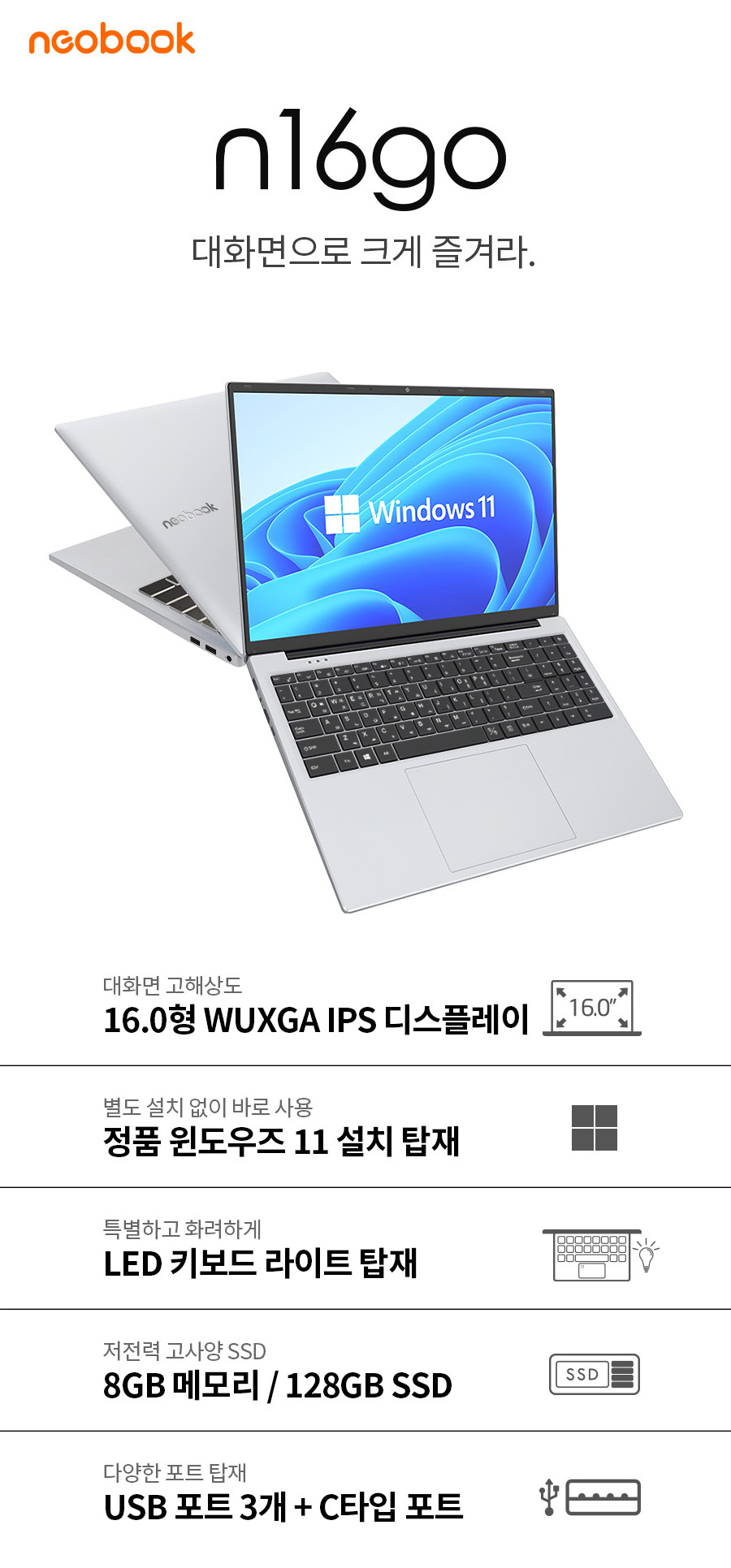 네오북 NEOBOOK N16GO(실버) 16형 대화면 디스플레이 윈도우 11 탑재 8GB 128GB SSD 노트북