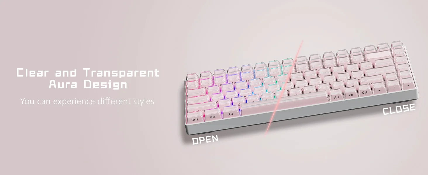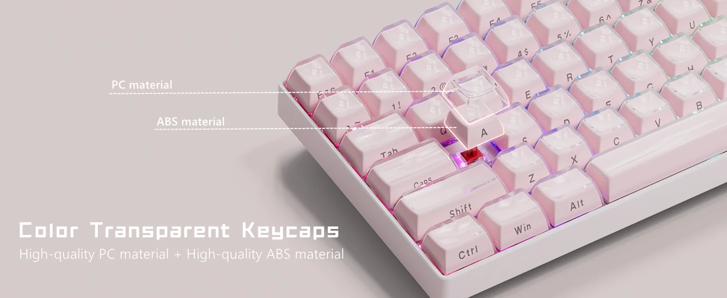 《 컬러 투명 키 캡 》 이 키 캡은 고품질 PC 소재와 고품질 ABS 소재로 만들어졌습니다. 이중 레이어로 쌓여 있으며 RGB 조명이 희미하게 표시되어 키보드의 분위기를 높이고 키보드를 독특하게 만듭니다. Letter 측면 조각 스타일은 기계식 키보드의 단순성을 더 잘 보여줍니다.