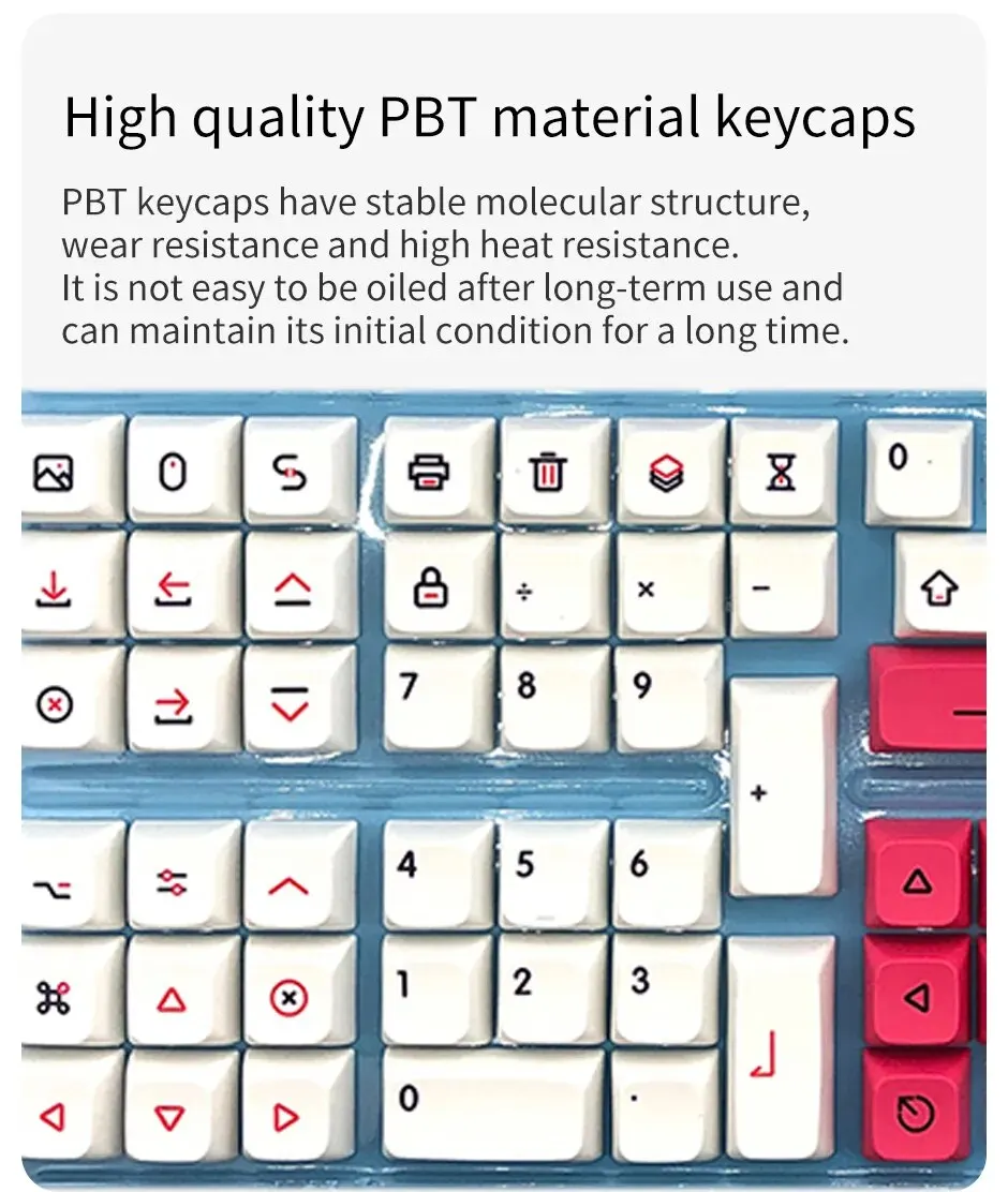 ? 튼튼한 물자:키 캡은 내구성이 뛰어나고 오래 지속되는 고품질 PBT 소재로 만들어져 빈번한 사용을 견딜 수 있습니다.