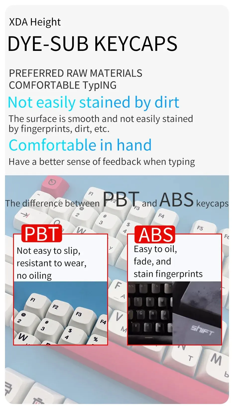 A3: ABS 키 캡과 비교하여 PBT 키 캡은 내구성이 뛰어나고 마모되기 쉽지 않습니다. PBT 키 캡은 더 나은 질감과 편안한 느낌을 가지고 있습니다.