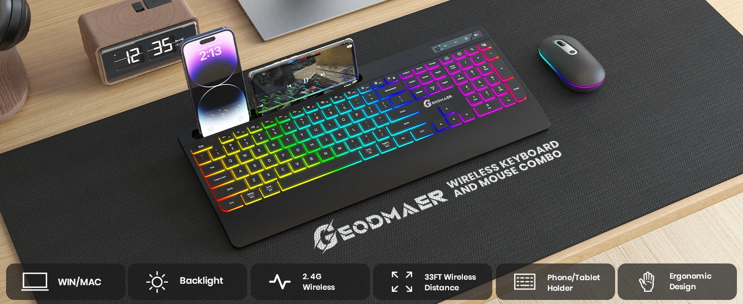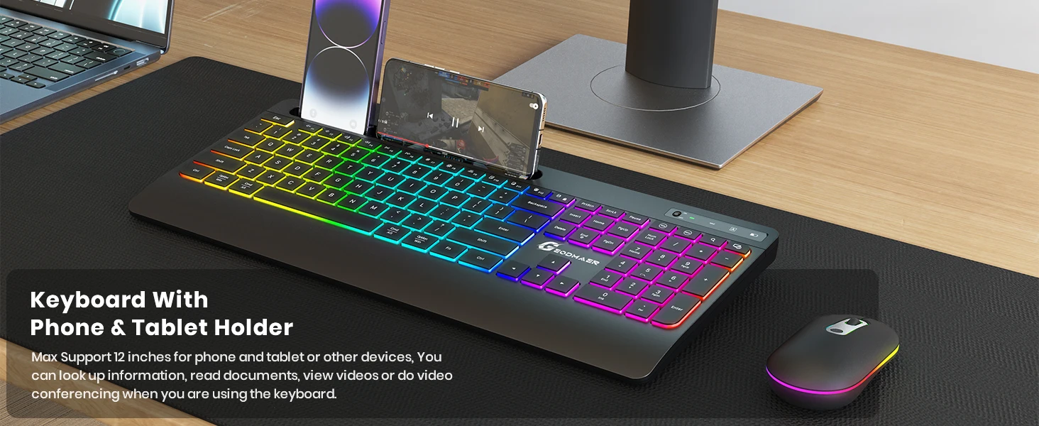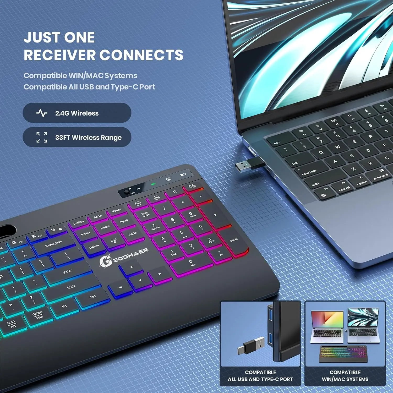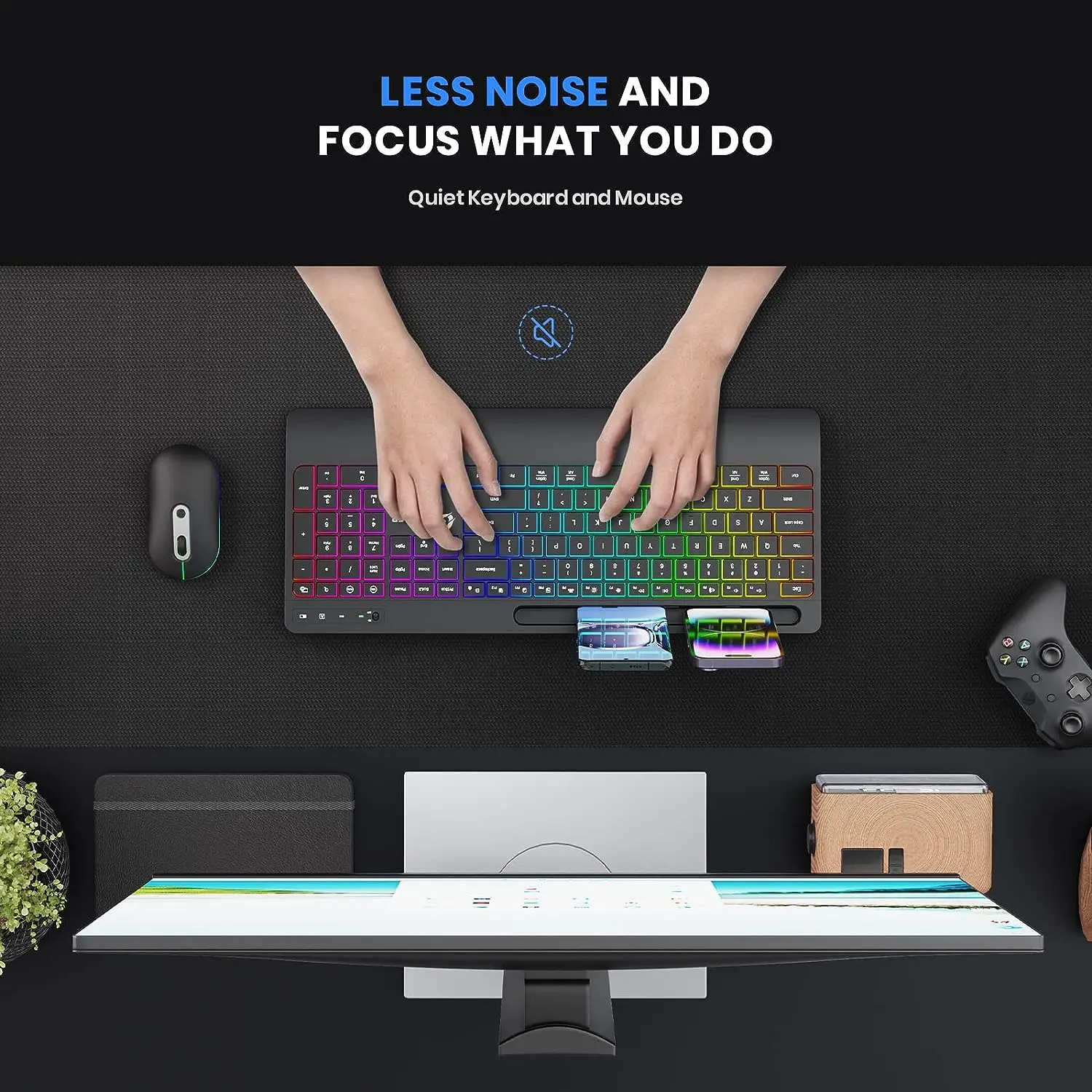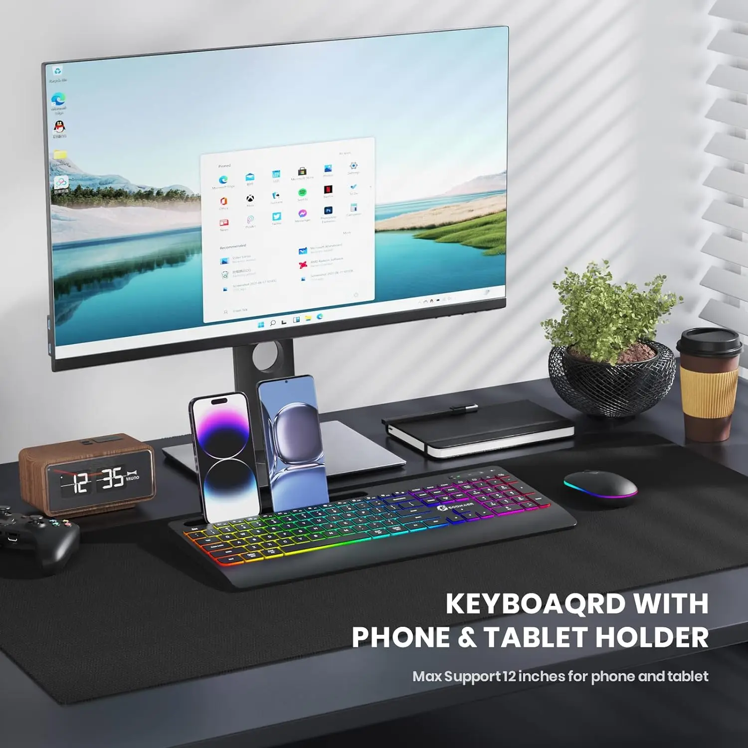 전화 홀더가 있는 무선 키보드 및 마우스 콤보, 손목 받침대, 저소음 충전식 백라이트 풀 사이즈 인체공학적 키보드, 마우스