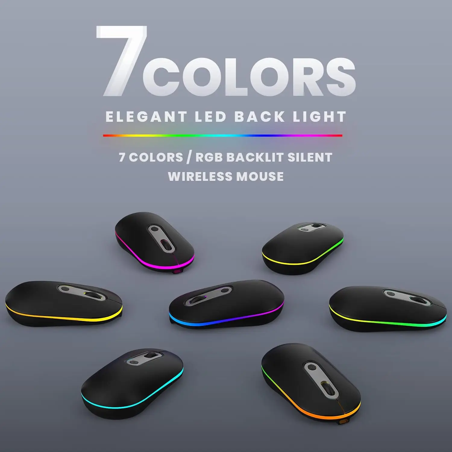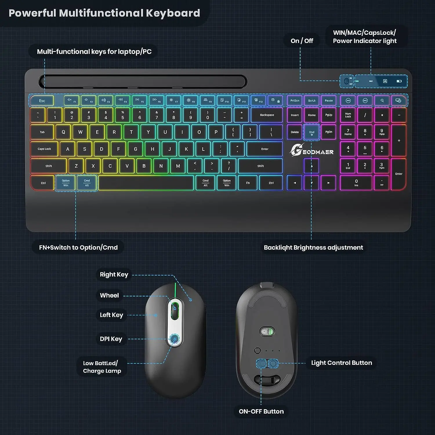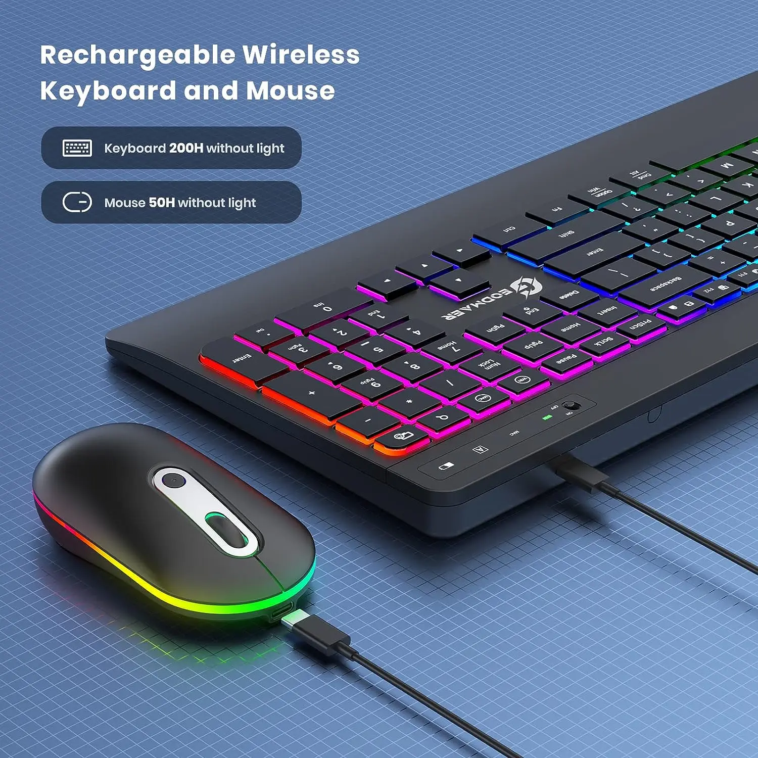 【백라이트 무선 키보드 및 마우스 콤보】 희미한 환경에서도 모든 문자를 명확하게 볼 수있는 문자 반투명 기능이있는 백라이트 키보드 및 마우스 콤보, 3 가지 조절 가능한 밝기 레벨이있는 2.4G 무선 키보드, 호흡 빛 효과와 7 색상/RGB 백라이트가있는 무선 마우스.