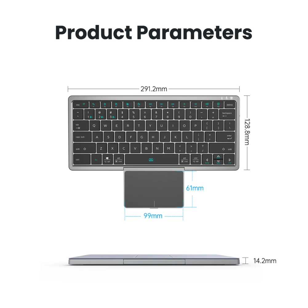 특징: 1. 은폐 가능한 노트북 터치 패드:노트북 터치 패드의 동일한 사용 환경을 보관 및 유지하기에 편리합니다. 보호 + 휴대 전화/태블릿 지원, 투인원 PU 가죽 보관 케이스, 사용하지 않을 때 방진 및 물보라 방지, 휴대 전화/태블릿 지원 접힘. 2. 3 채널 무선 블루투스 호환 연결:사무실과 일상 생활에 편리한 다양한 장치 간의 효율적인 전환. 3. 내장 충전식 리튬 배터리:경제적이고 환경 친화적 인 250mAh 충전식 리튬 배터리. 4. 가위 발 구조 키:노트북 컴퓨터와 동일한 키 구조로, 노동력 절약과 편안하고 완벽한 타이핑 느낌. 5. 여러 시스템 및 장치 지원:안드로이드, iOS 및 Mac OS 장치 용 윈도우와 호환됩니다. 사양: 인증: CE 원산지: 중국 본토 주요 제어 칩: PCT 2860 5.2 절전 모드: 10 분 동안 작동하지 않음 작동 전류: 블루투스 호환 타이핑 모드 ≤ 1.5Ma 대기 시간: 400 시간 작동 전압: 3.3V4.2V 배터리: 리튬 배터리 250mAh 수면 모드 현재:<30uA 충전 전류: ≤ 150mAh 대기 모드 전류:<0.5mA 스위치: 가위 풋 스위치 작업 거리: ≥ 8m 충전 포트: 유형-c 전압: 알람 LED가 3.3V 이하로 깜박이고 3.0V 이하에서는 작동하지 않습니다. 시스템 호환성: WinXP, Win7 용, Wn0 (PC) 용, Win10 (PC) 용, 안드로이드 5.0.2 이상 태블릿 및 휴대 전화 & iOS 6.3.2 이상 태블릿 및 휴대 전화/Mac OS 10.1 이상 Mac 컴퓨터 용. 키보드 크기: 291.2x128.8x14 정보. 2mm/11.45x5.07x0.55 터치 패널 크기: 약 99x6 1mm/3.89x2.40inch 키 캡 수: 78 키 키보드 무게: 460g 참고:
