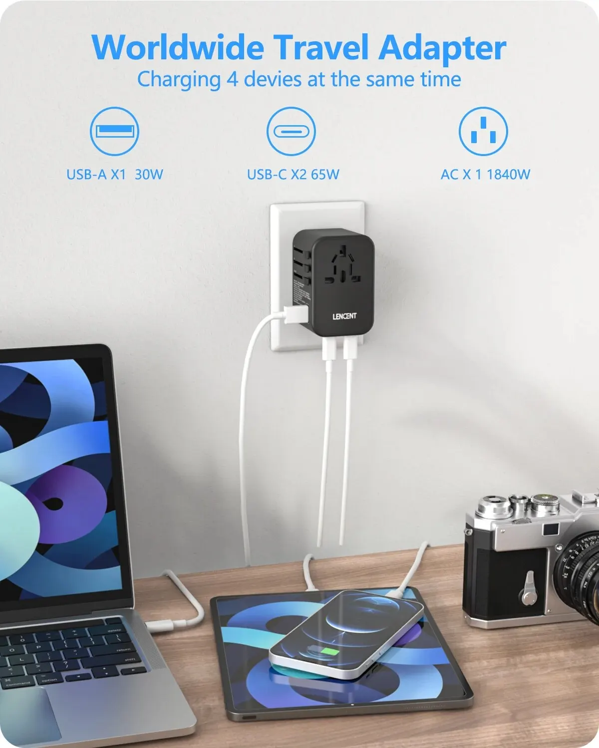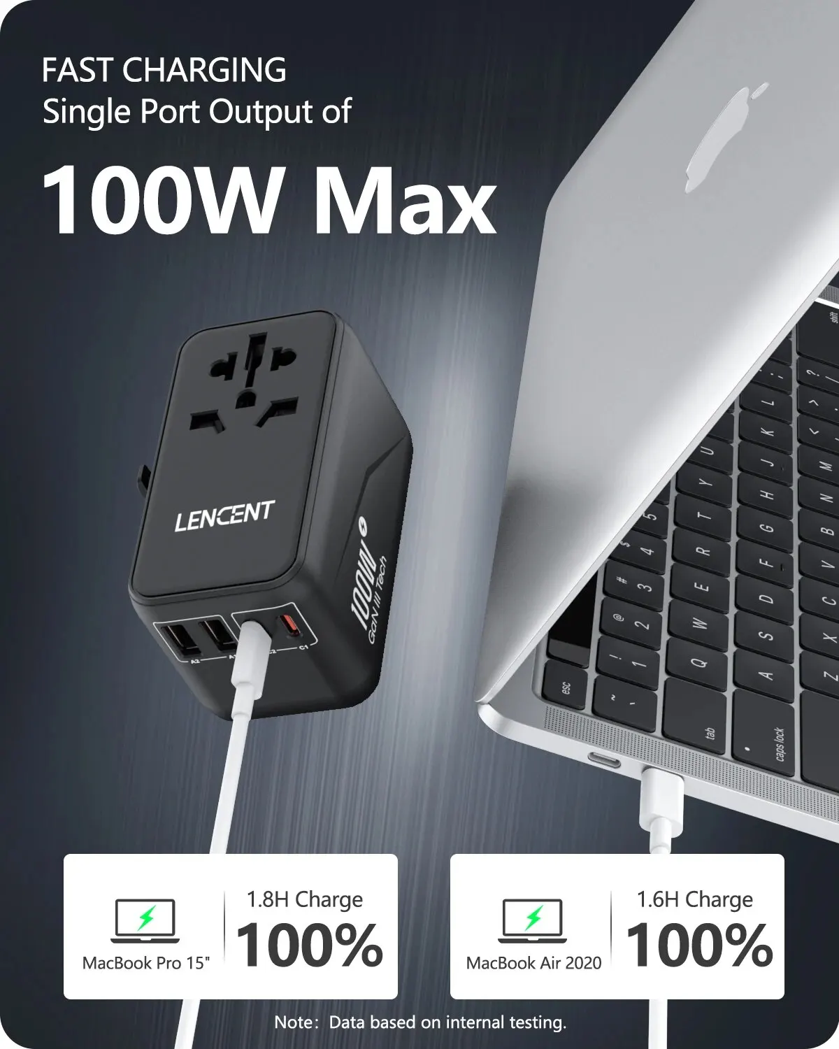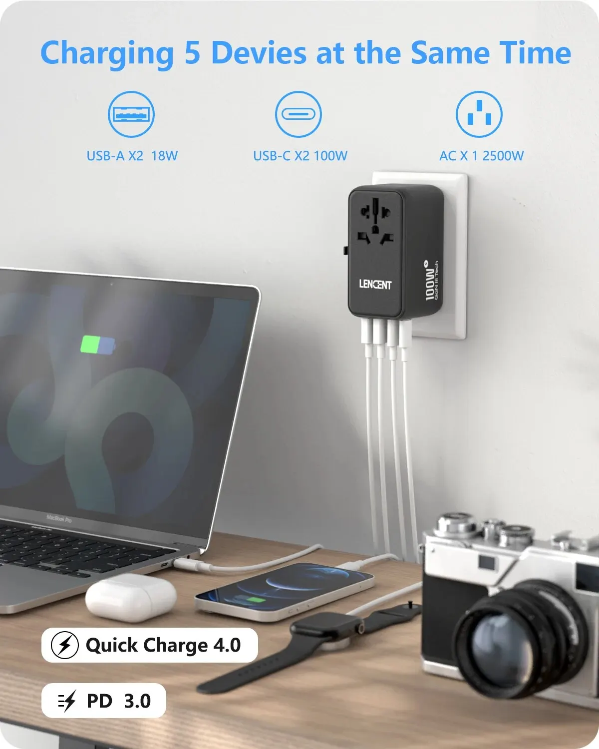2 개의 USB 포트 및 3Type C 포트가있는 LENCENT 여행용 어댑터는 지능적으로 연결된 장치를 식별하고 최적의 충전 전류를 감지하고 전달하여 빠르고 안전한 충전을 보장합니다.