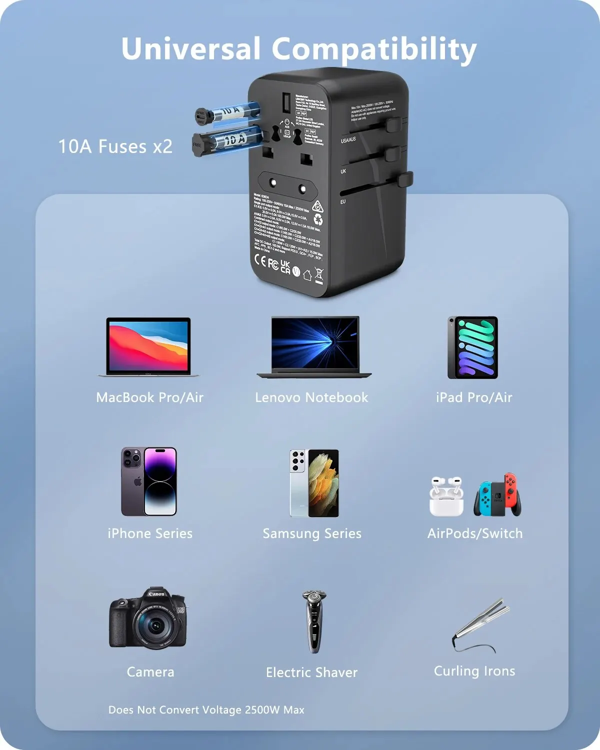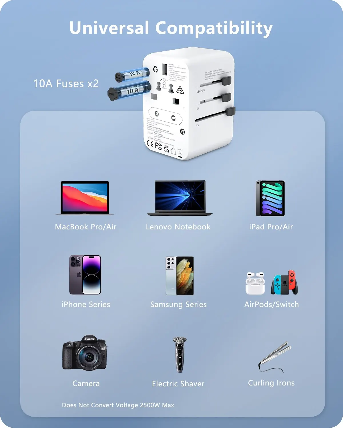 이 작고 가벼운 10A 올인원 여행용 어댑터는 AC 소켓 1 개, USB 포트 2 개, C 타입 3 개로 6 개의 장치를 한 번에 충전할 수 있습니다. 울트라 휴대용 디자인 (무게: 226g, 크기: 8.3x8x6.3cm) 으로 수하물 공간을 많이 절약 할 수 있으며 추가 어댑터 나 소켓을 휴대 할 필요가 없습니다.