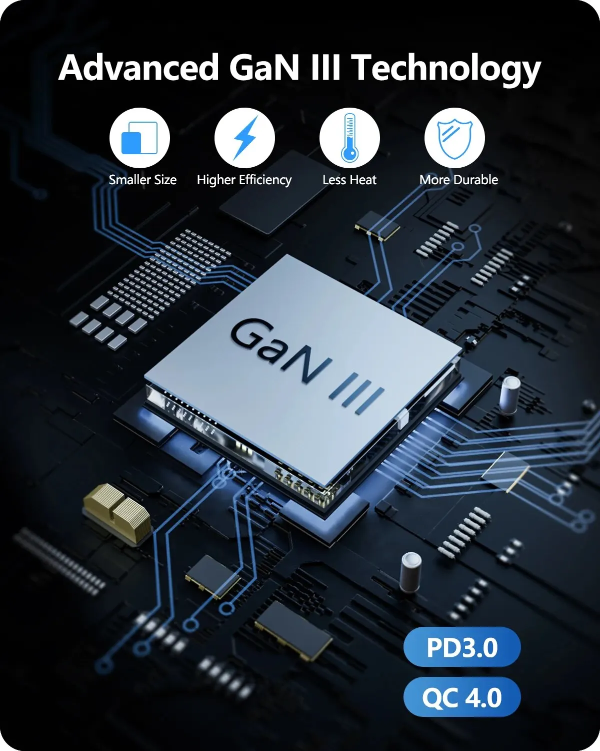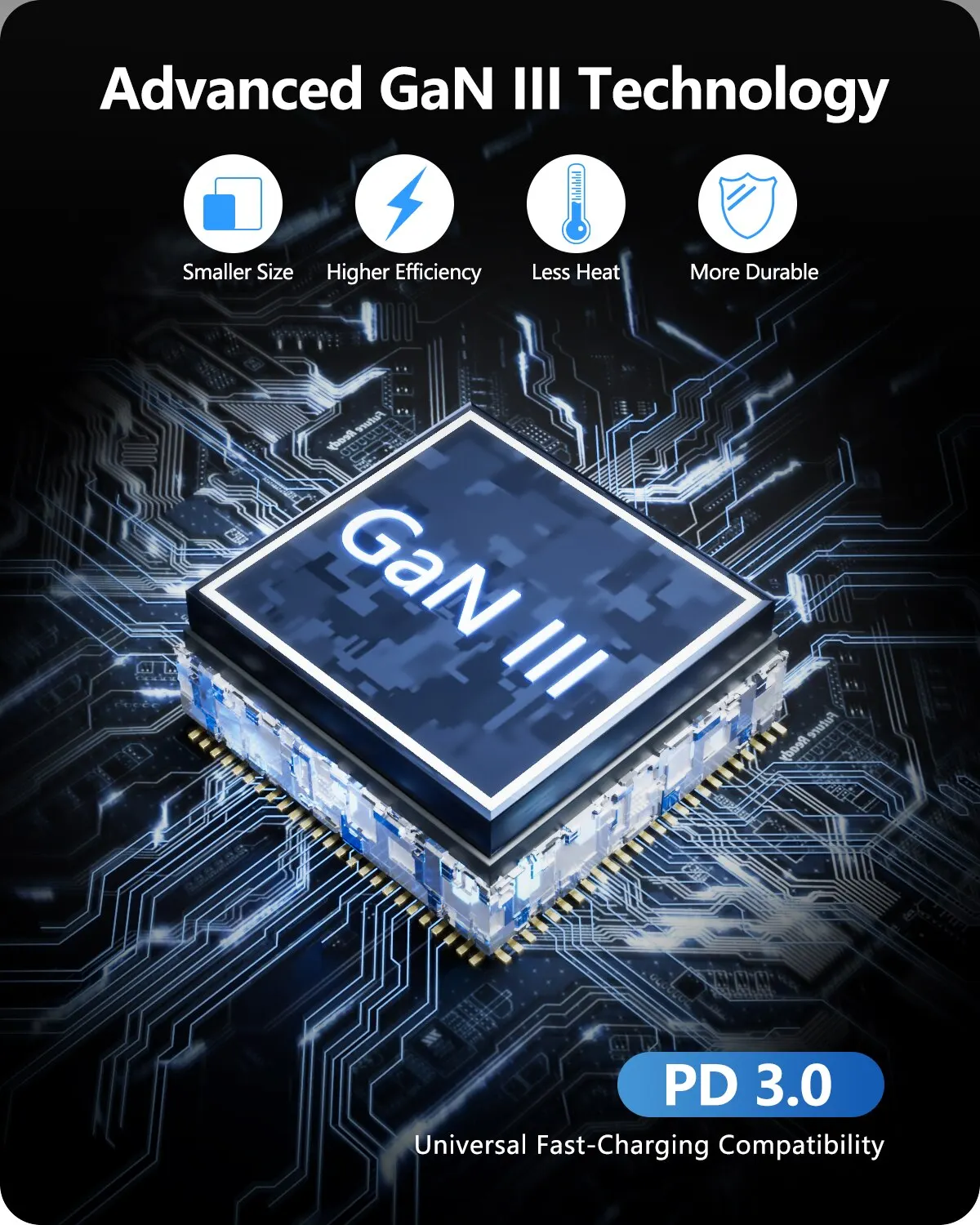 3 세대 GaN 반도체 재료는 더 낮은 열 복사로 더 높은 전기 전도를 제공하여 여행 어댑터를 더욱 강력하고 훨씬 작게 만듭니다.