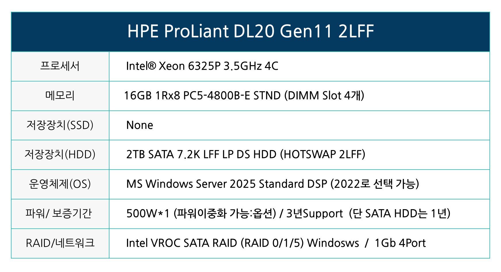 에이치피이 DL20 Gen11 2LFF Xeon 6325P 3.5G 16GB 2TB 2025OS