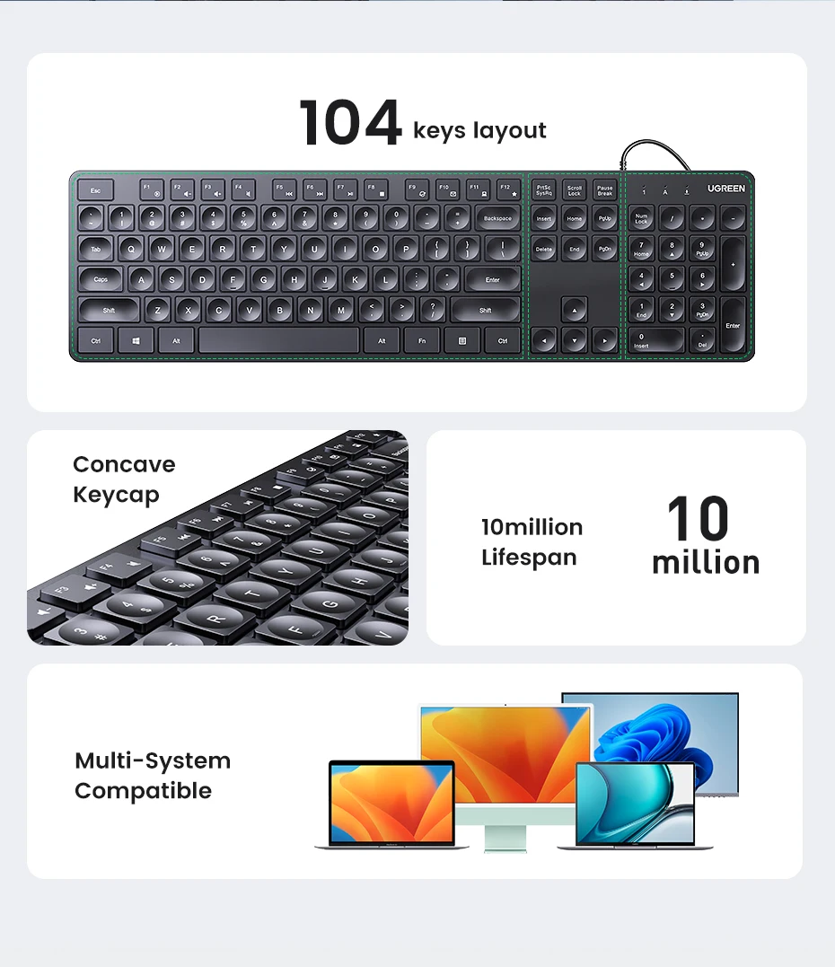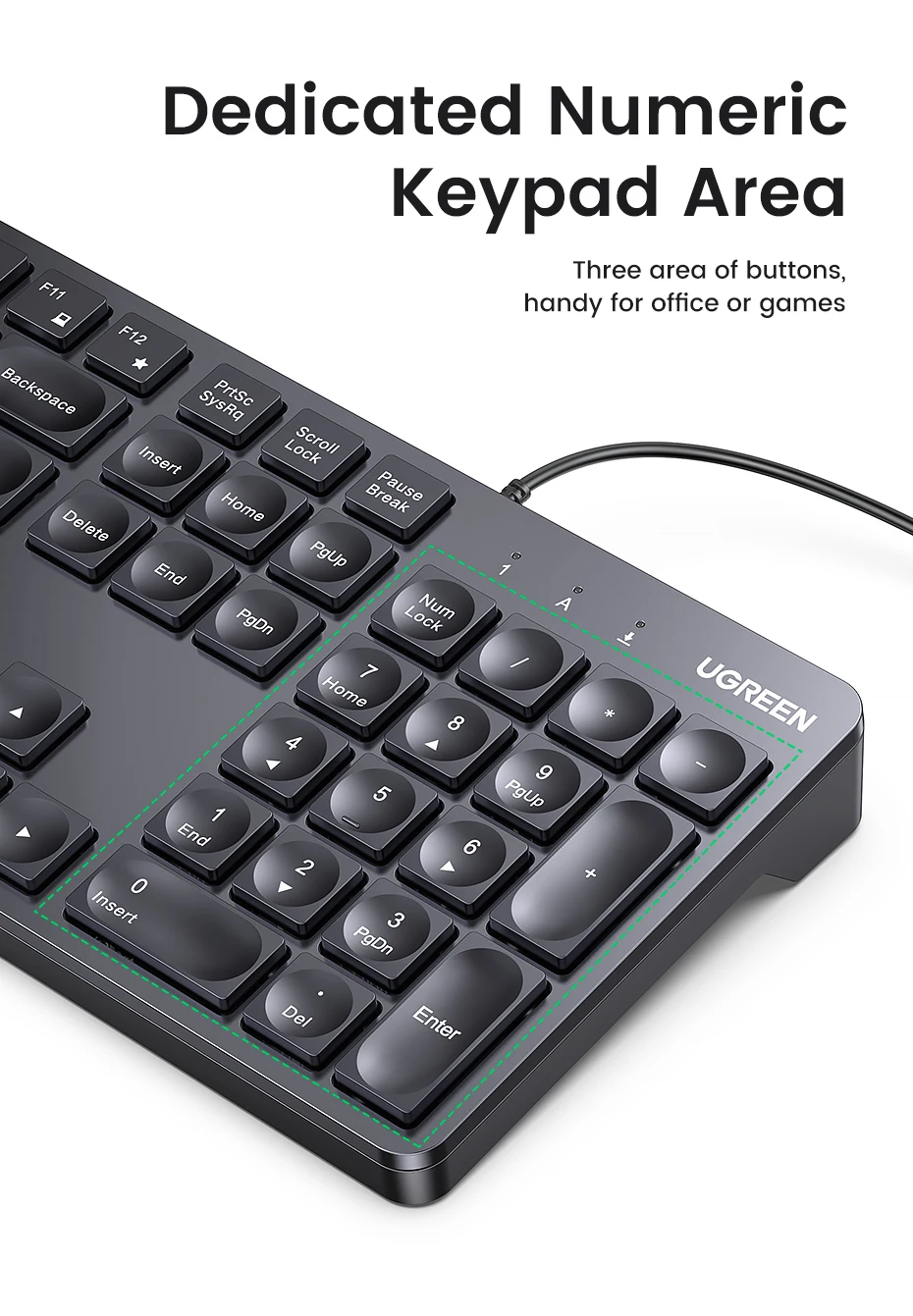 키캡놀이 UGREEN 유선 미국 레이아웃 영어 키캡 104 키 풀 사이즈 PC 노트북용 인체공학적 USB 키보드 1.5M
