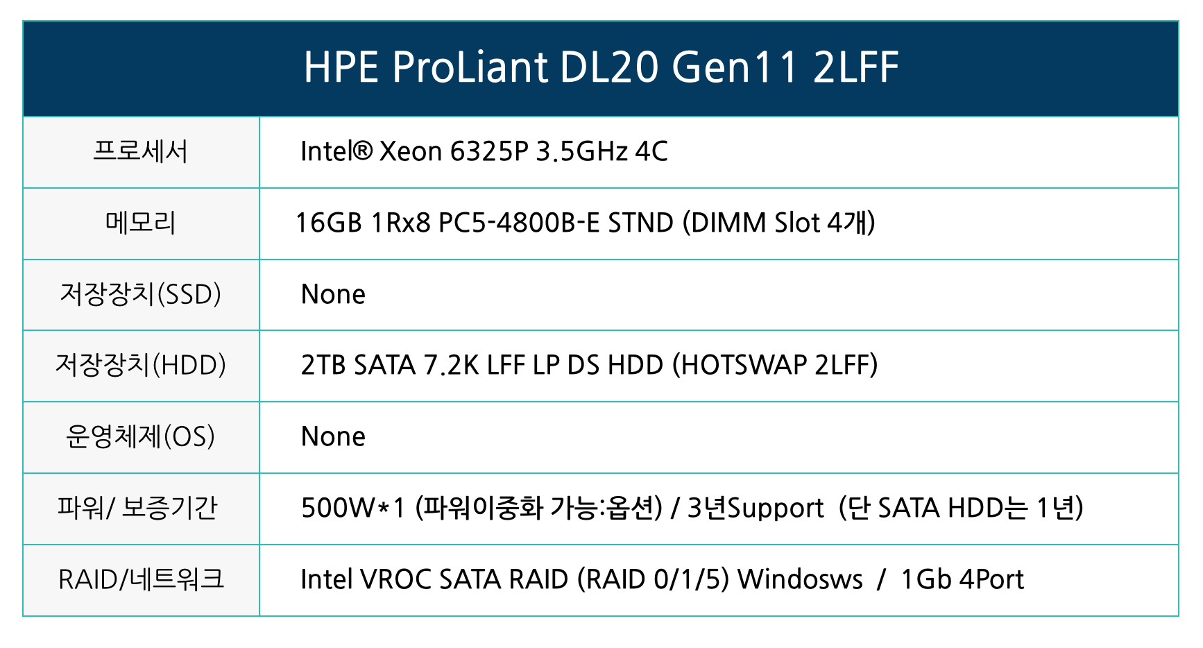 에이치피이 DL20 Gen11 2LFF Xeon 6325P 3.5G 16GB 2TB