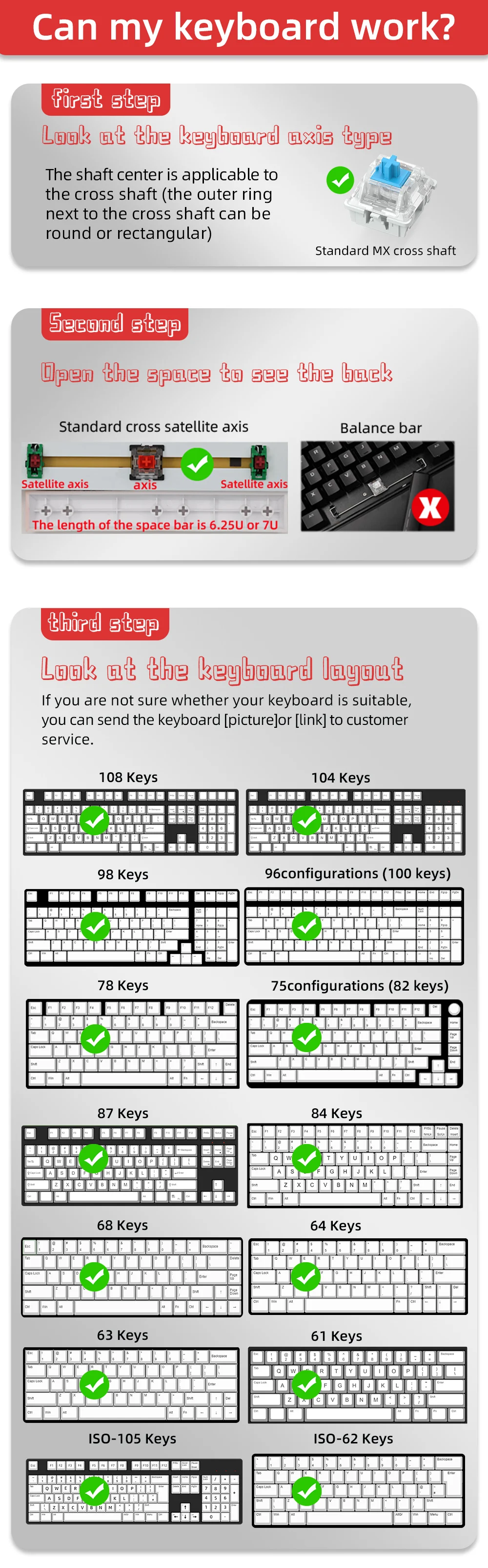 ★【대부분의 기계식 키보드와 호환】 이 키캡 세트는 대부분의 dz60/GK61/63/64/68/KBD75/81/82/83/84/87/96(100key) 에서 작동합니다./98/102/104/108 체리 MX 스위치 기계식 게임 키보드 및 Outemu, Kailh 및 Gateron 스위치와 가장 표준 ANSI 키보드에 적합합니다.
