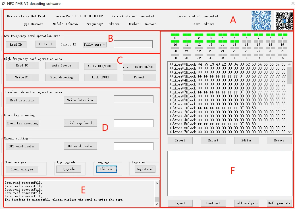 E 영역: 카드 읽기 상태 및 섹터 디코딩 진행률, 암호화된 데이터 가져오기/내보내기, 수정 편집 및 데이터 비교 기능 작업 영역.