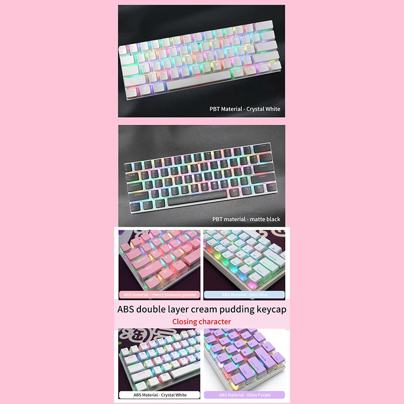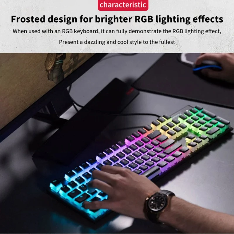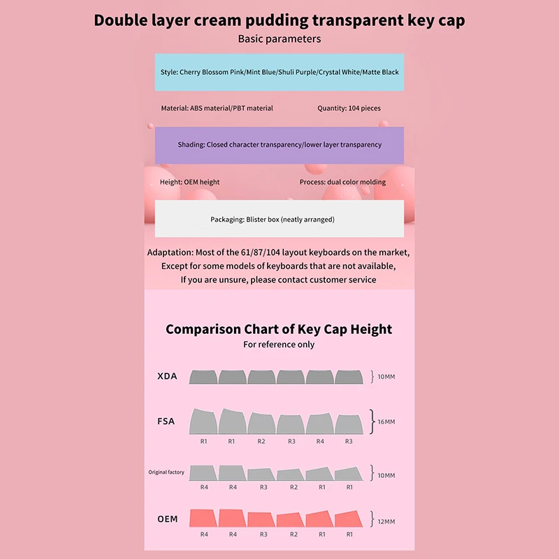 1. 하이 퀄리티 소재: PBT 더블 레이어 푸딩 투명 키보드 캡 내열 및 내마모성이 우수한 내구성 PBT 소재를 채택, 장기간 사용하는 동안 원래의 질감과 색상을 유지할 수 있습니다.