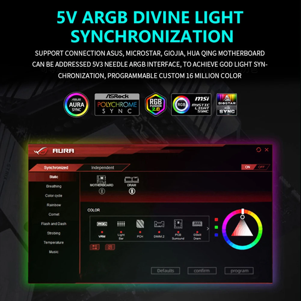 3.ARGB 미스틱 라이트 동기화:SSD 쿨러는 ASUS, MSI, 기가 바이트 및 ASRock과 같은 브랜드의 마더 보드에서 ARGB 5V 인터페이스에 대한 연결을 지원합니다. 최대 16.8 만 개의 색상을 정의 할 수있는 기능으로 조명 효과를 소프트웨어로 제어 할 수 있습니다. 트루 컬러 ARGB 조명 스트립은 생동감 있고 부드러운 풀 컬러 디스플레이를 선보이며 방열판 위에 렌즈와 같은 놀라운 빛을 끝없이 연출합니다.