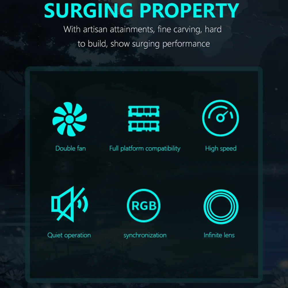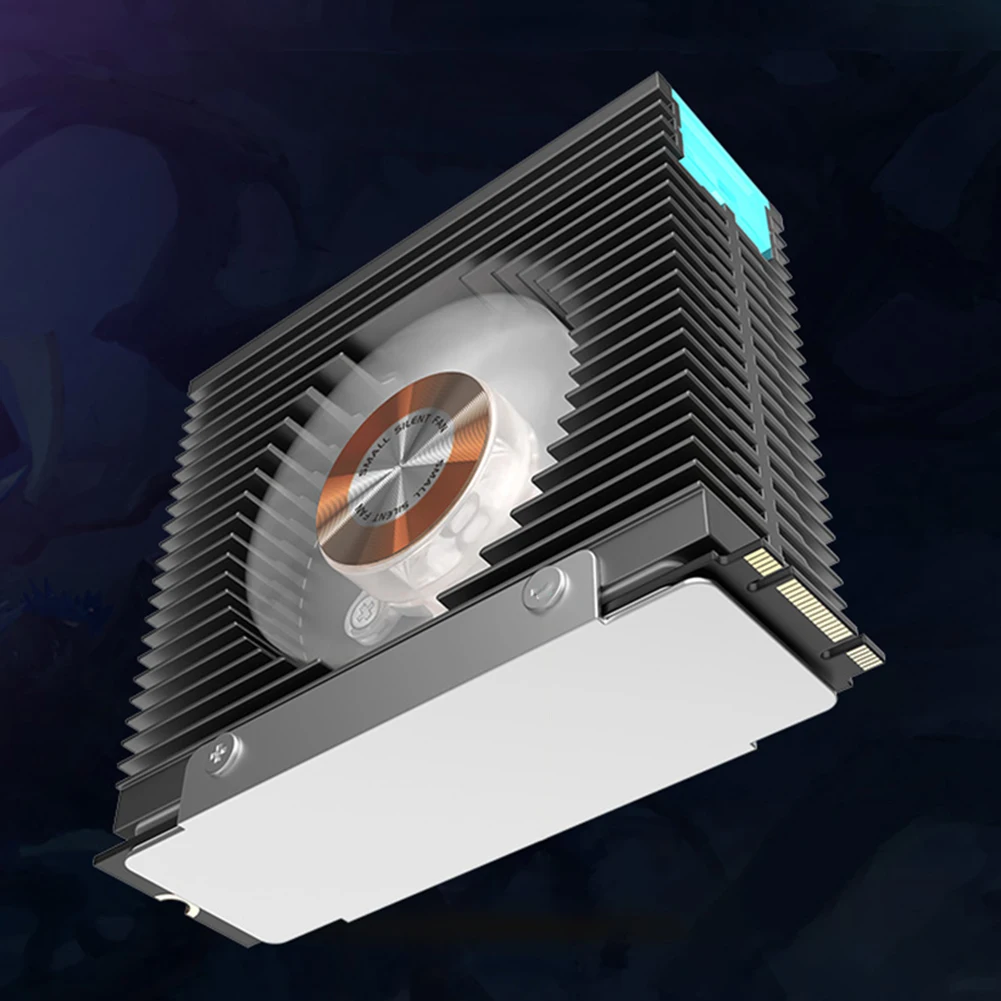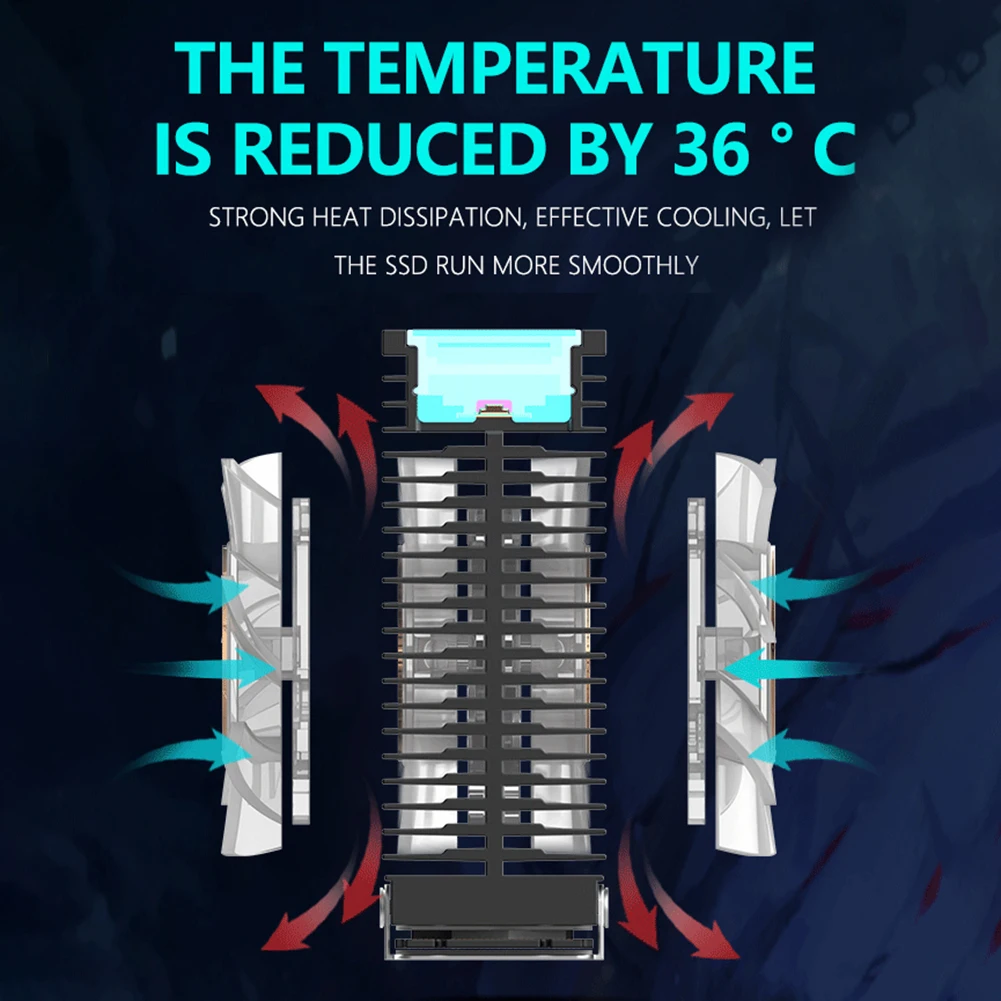 1. 듀얼 팬 고효율 냉각:M.2 2280 SSD 방열판은 50mm 유압 베어링 무음 팬 2 개를 장착하여 공기 흐름을 두 배로 높여 M.2 솔리드 스테이트 드라이브 (SSD) 의 온도를 30 도 이상 효과적으로 낮출 수 있습니다. 이는 안정성과 안정성을 보장하고 SSD의 수명을 연장시킵니다. 팬 속도는 1000-4500 RPM에 도달하여 냉각 효과를 극대화 할 수 있습니다.