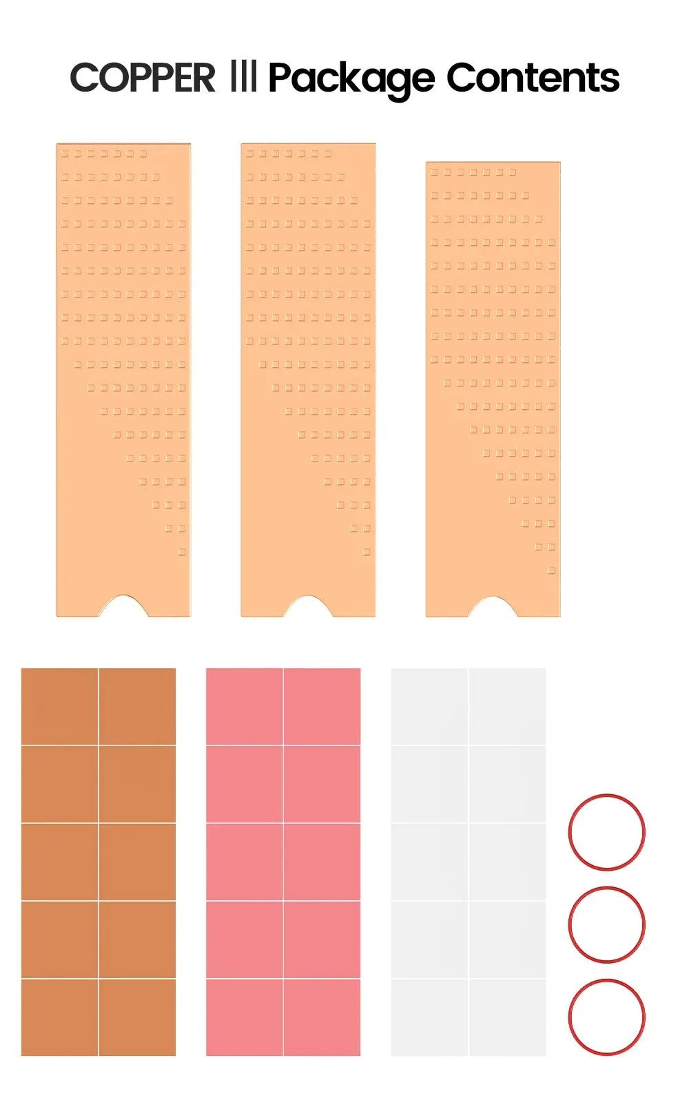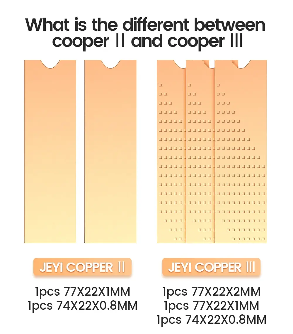 【포장 목록】 JEYI 구리 Ⅱ: 1 개 74*22*0.8mm 및 1 개 77*22*1mm 구리 방열판. JEYI 구리 Ⅲ: 1 개 77*22*2mm, 1 개 77*22*1mm 및 1 개 74*22*0.8mm 구리 방열판