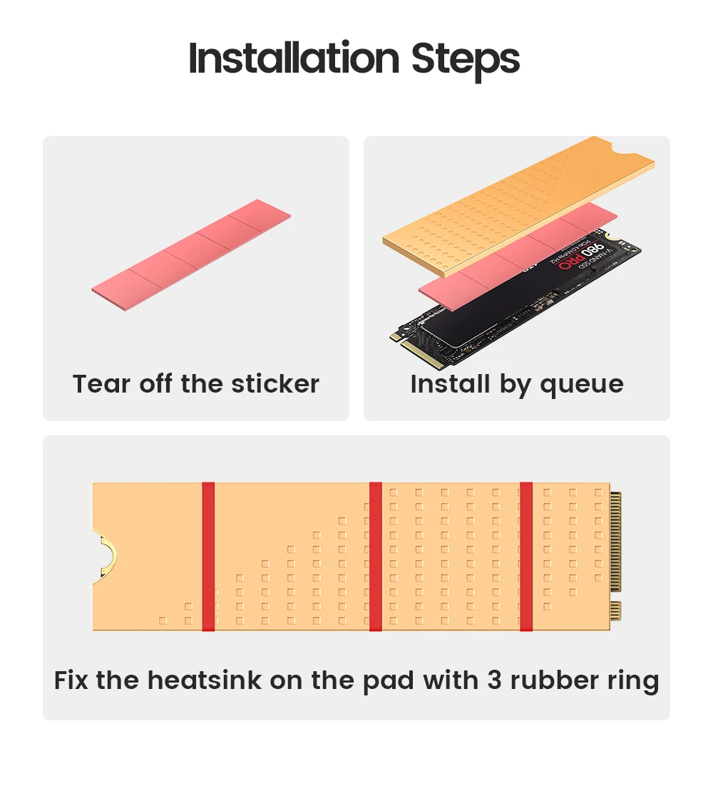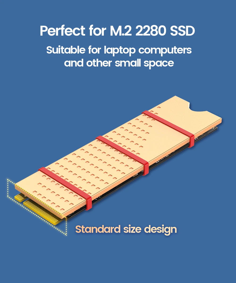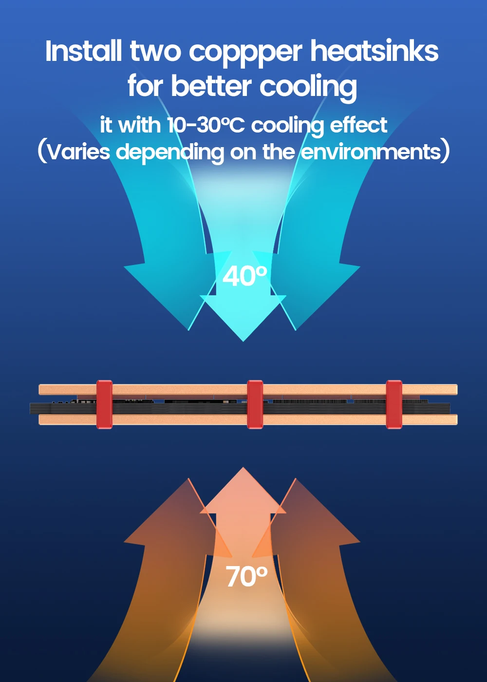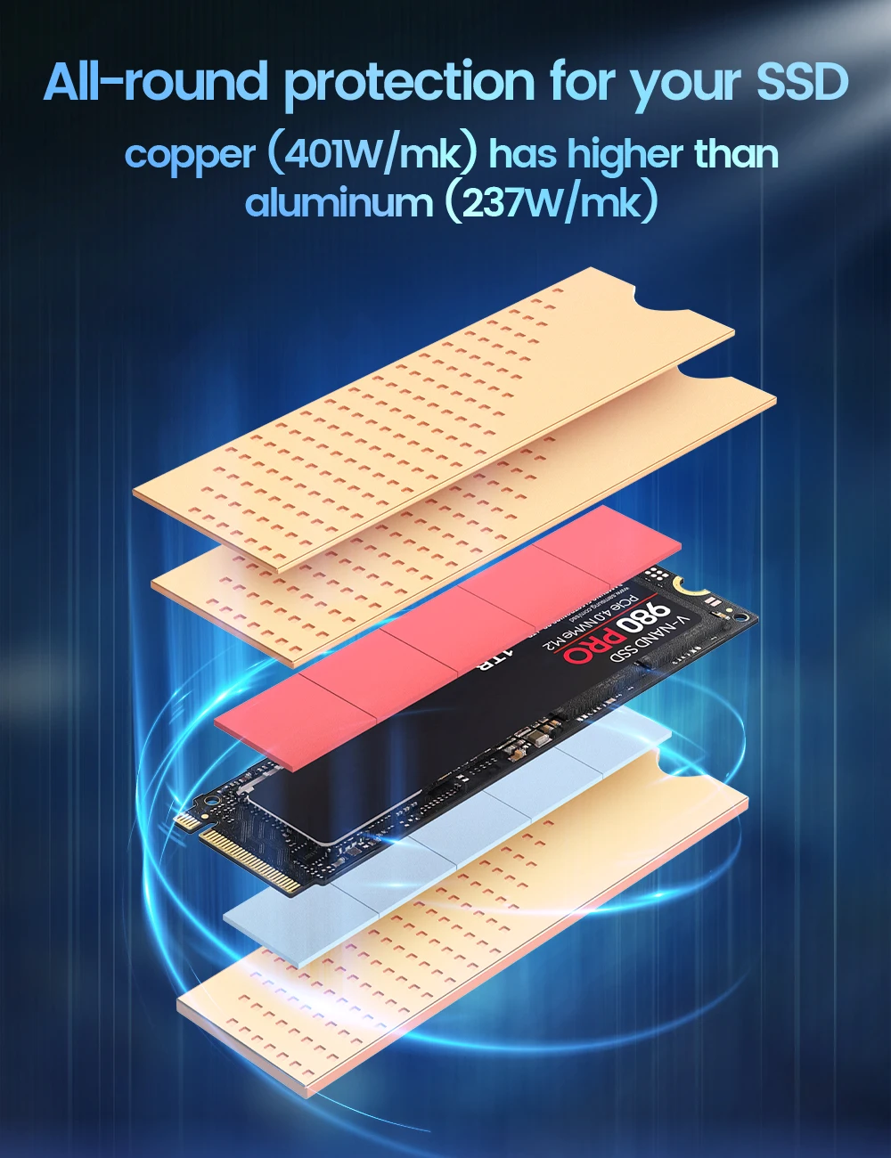 ? SSD 구리 쿨러:구리 소재는 SSD의 효과적인 냉각을 보장하여 과열을 방지하고 수명을 연장시킵니다.