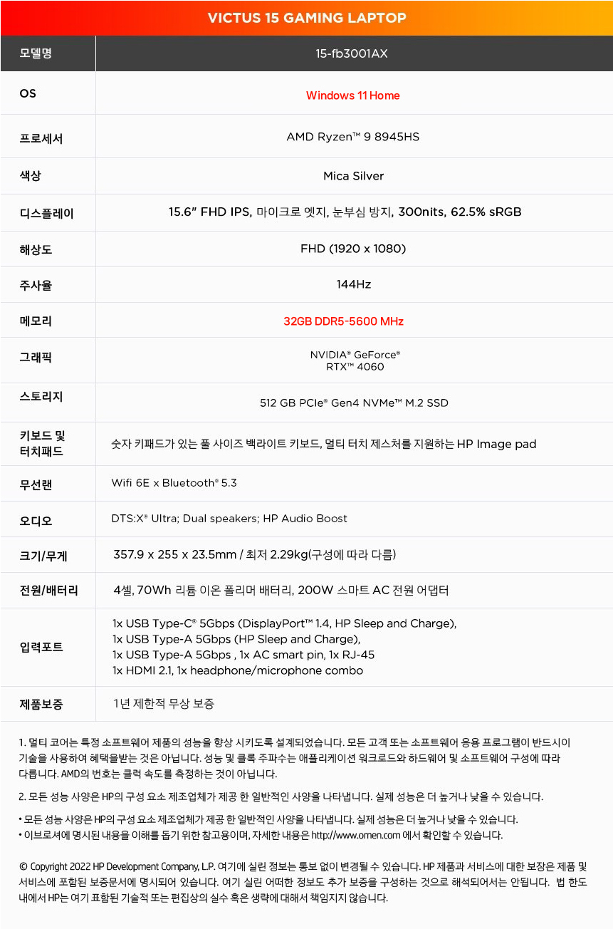 HP 노트북 2025 빅터스 15-fb3001AX AMD 라이젠9 RTX4060 D5-32GB 512GB Win11Home HMC