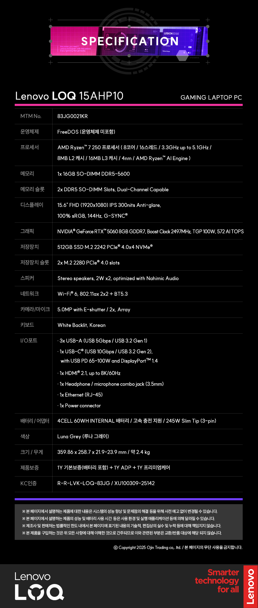 레노버 LOQ 15AHP10 R7 5060 WIN11 32GB램 (SSD 1TB)