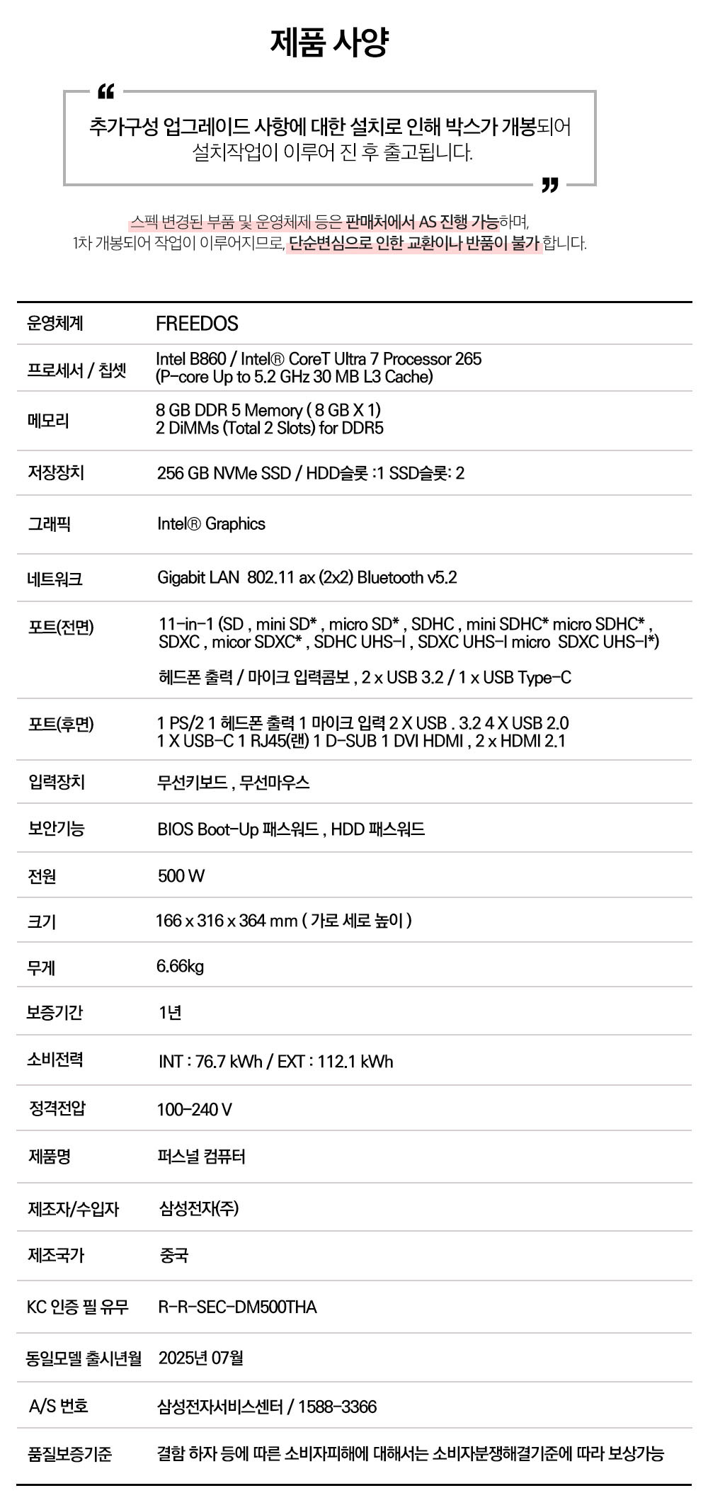 삼성 데스크탑5 DM500THZ-AD7A / 8GB 램 / NVMe SSD 256GB / WIN11PRO/EL