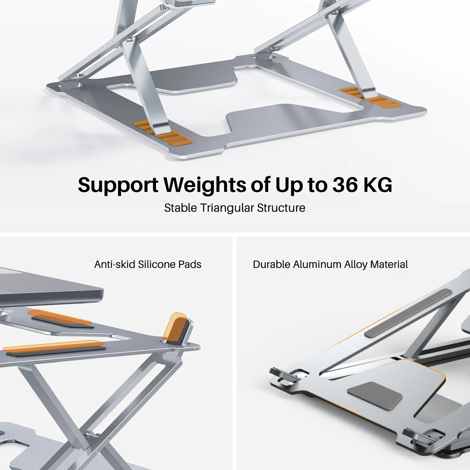 안정된 위치. 조절 가능한 스탠드는 내구성이 뛰어난 알루미늄 합금 소재와 강력한 삼각형 디자인으로 인해 최대 36 kg 의 무게를 지탱할 수 있습니다. 또한 장치가 홀더에서 미끄러지거나 긁히지 않도록 미끄럼 방지 실리콘 패드가 있습니다.