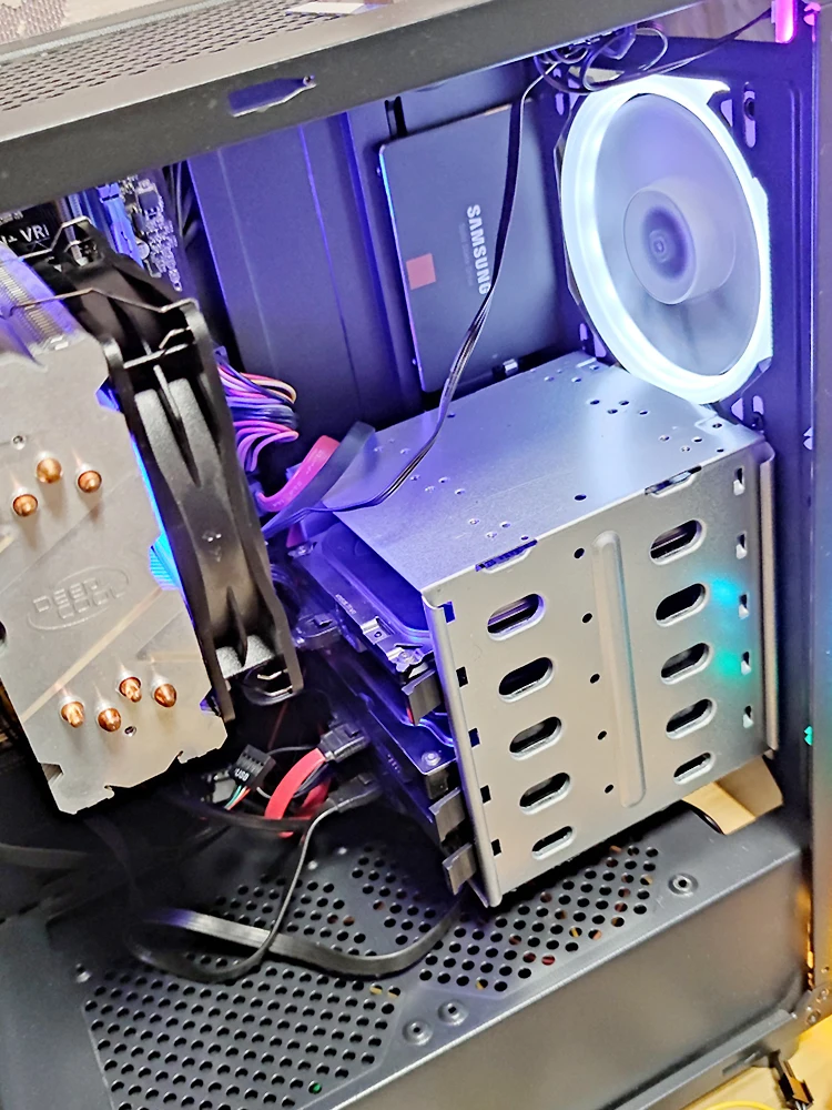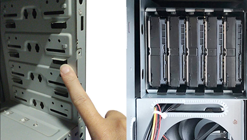 광학 드라이브 위치 내부에 돌출 트레이가 있으면 하드 드라이브 케이지에 부드럽게 삽입하기 전에 평평하게해야합니다.