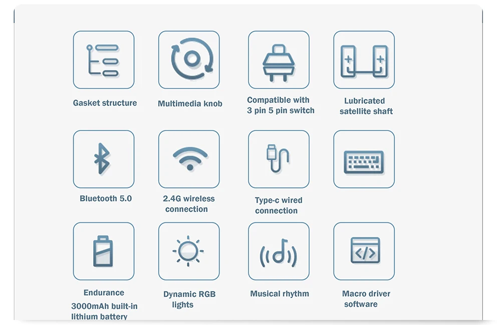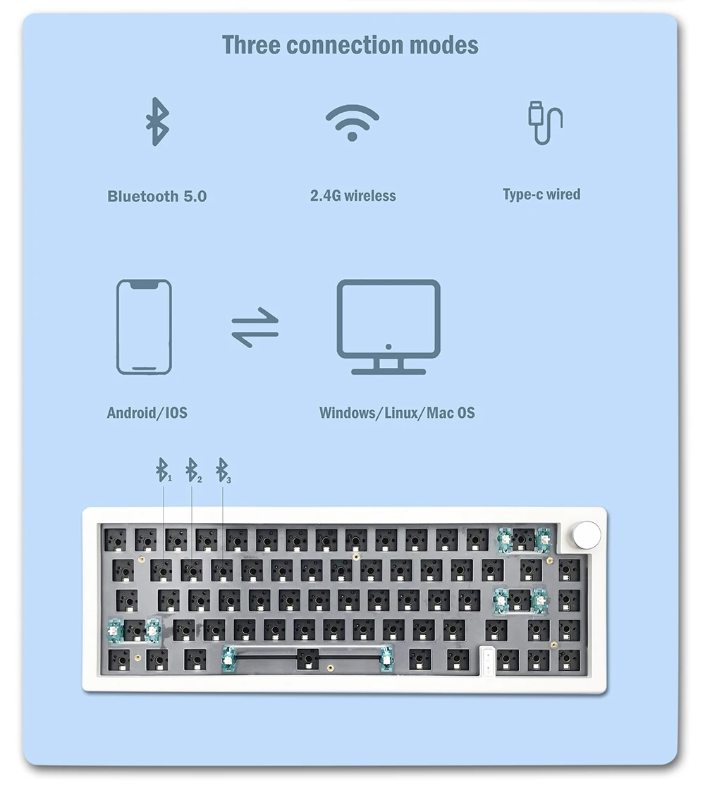 ? 블루투스 2.4g 및 RGB 백라이트:블루투스 2.4g 및 RGB 백라이트가 장착된 이 키보드 키트는 무선 연결과 몰입감 있는 타이핑 경험을 위한 멋진 비주얼을 제공합니다.
